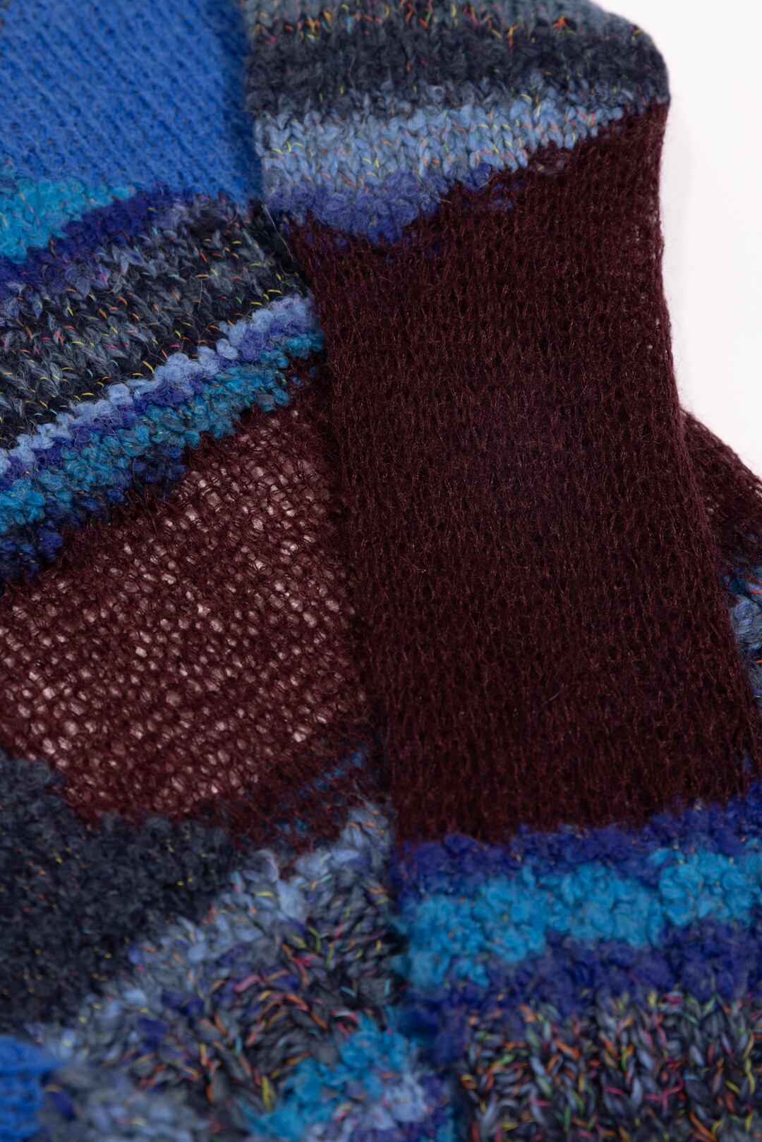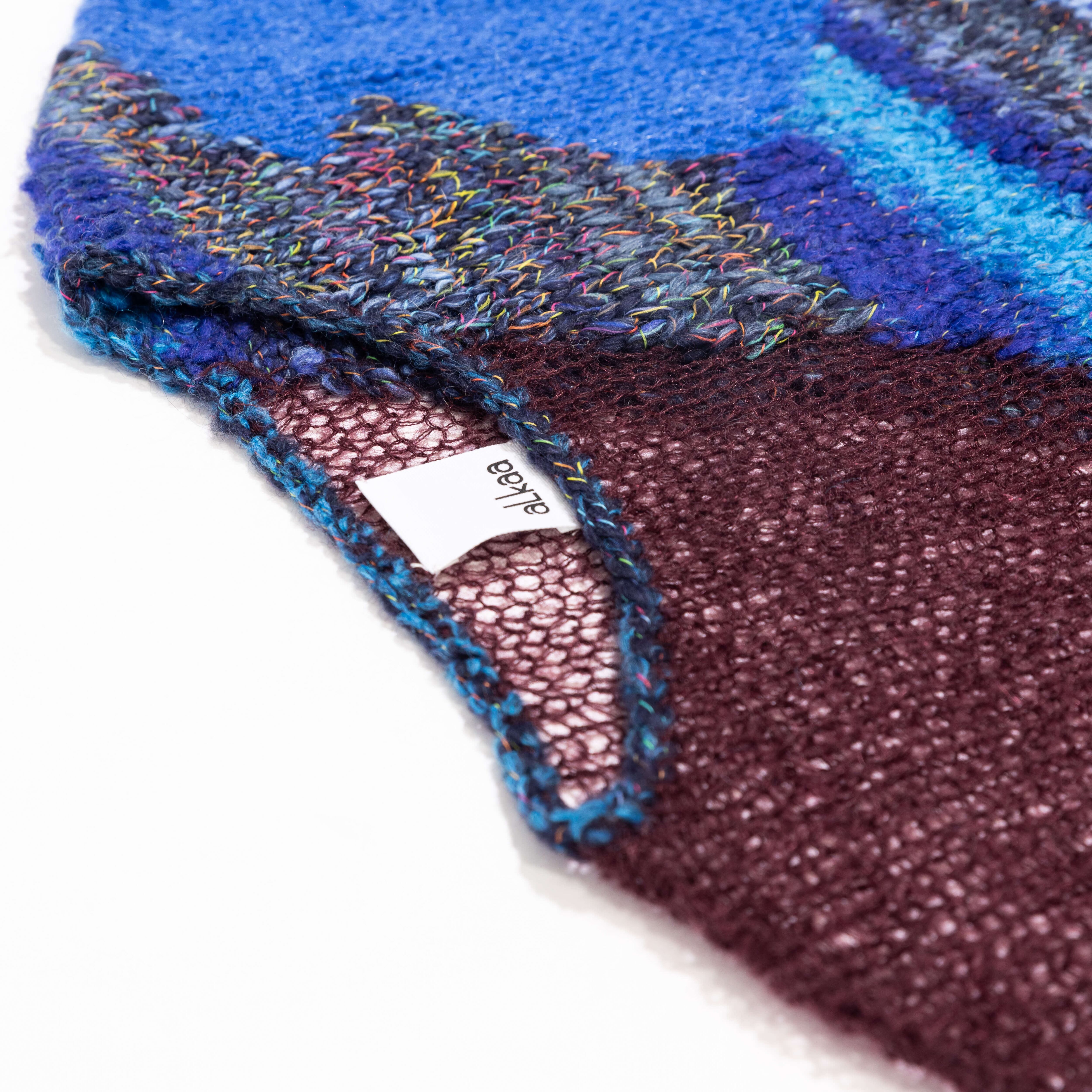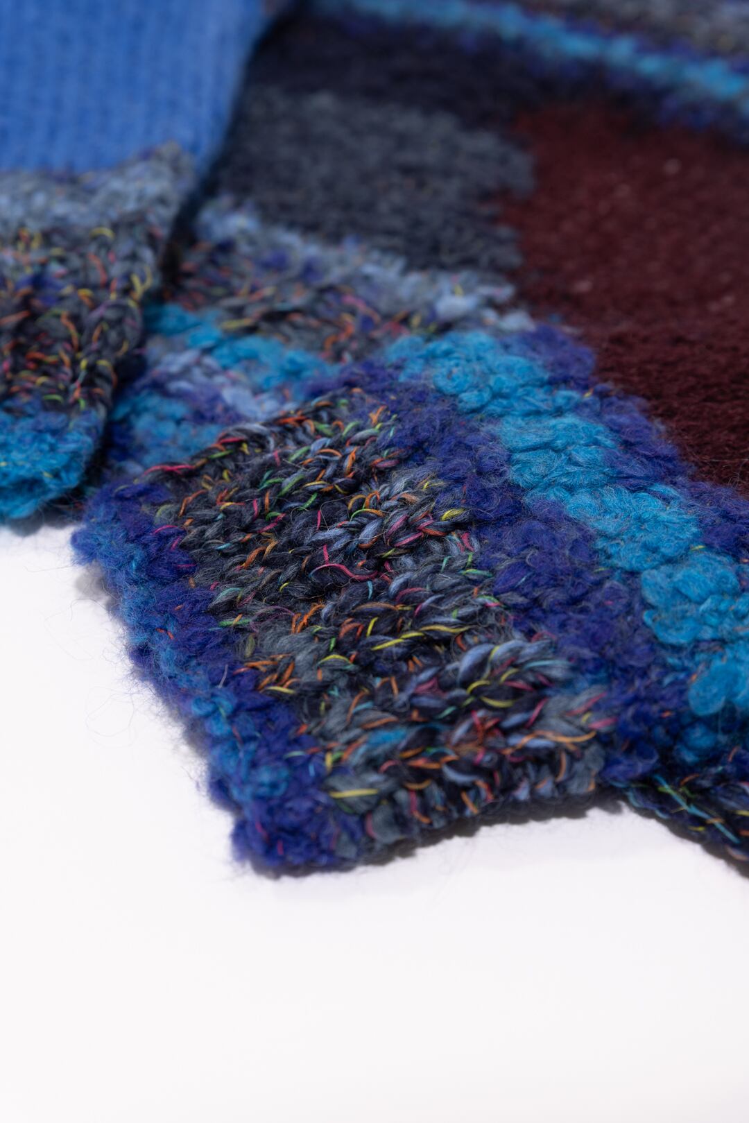 様々な形状のMixカラーのデザイン性の高いカラフルな糸を繊細なモヘヤ混の糸と組み合わせて大胆な柄の切り替えで編み上げたアートピースのようなハンドニットトップスです。