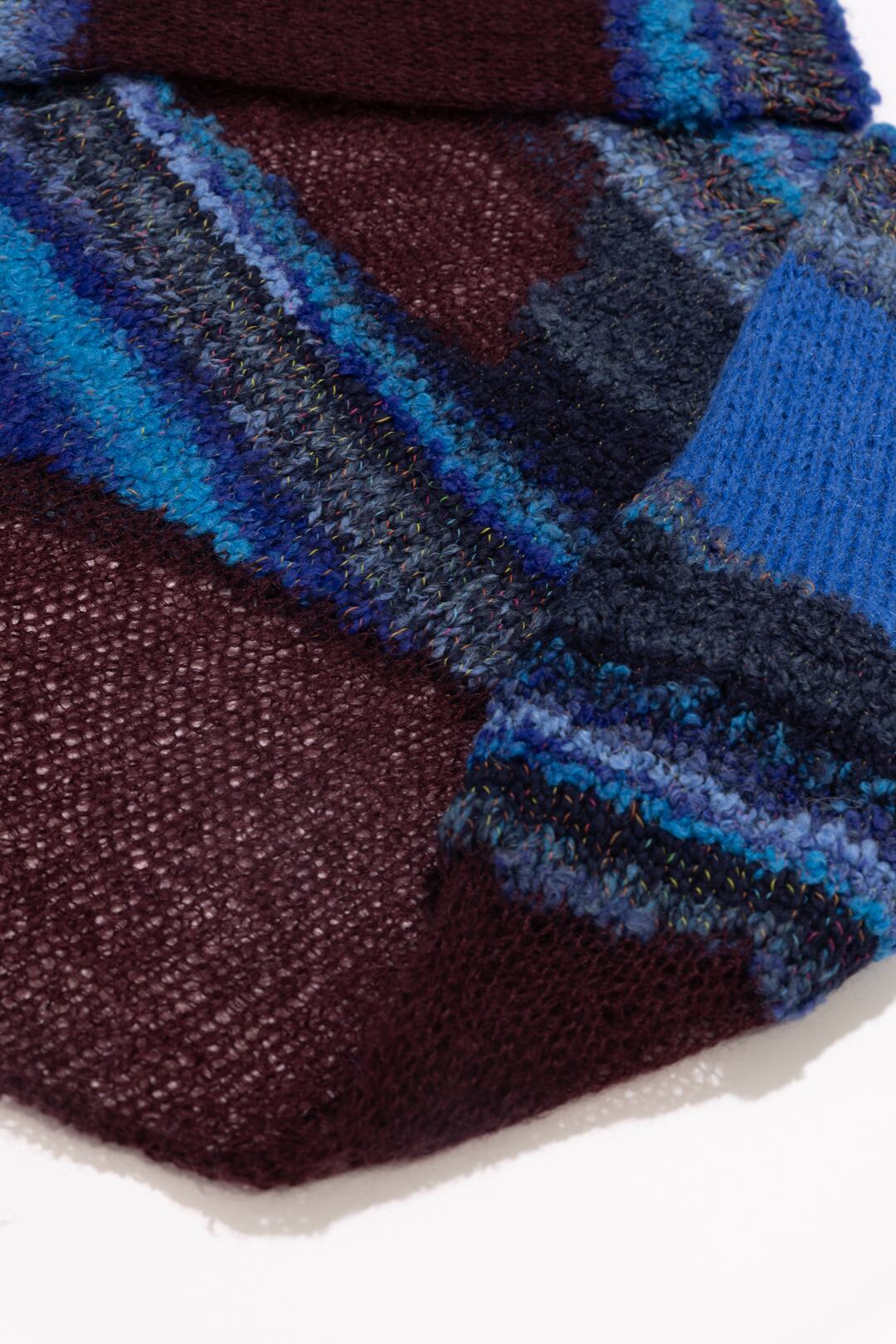 ブルー系MIXにトレンドカラーのボルドーを配し、デニムなどを合わせたカジュアルな着こなしも、ブラックアイテムと合わせてシックな着こなしも楽しめる、コーディネートの主役になるアイテムです。