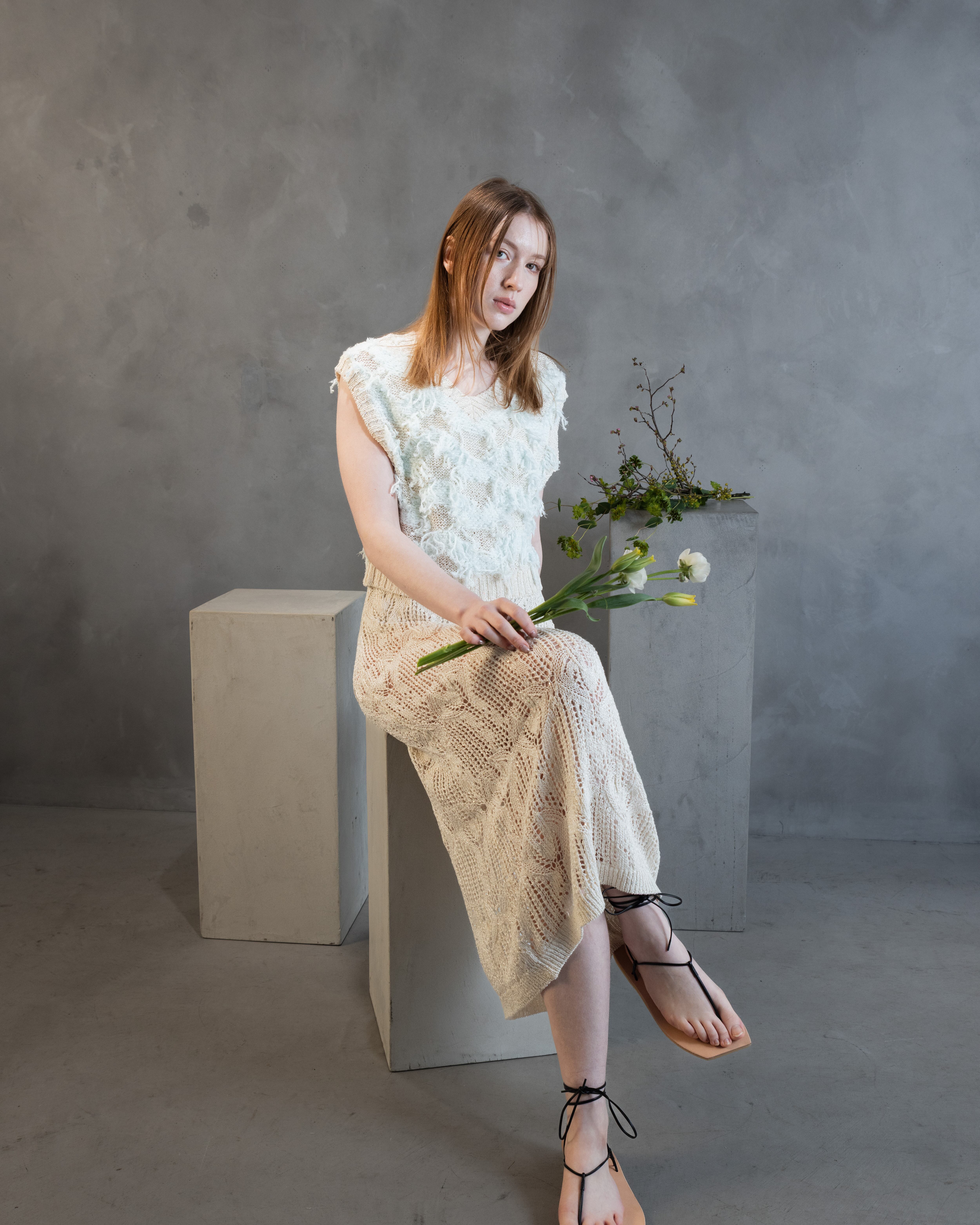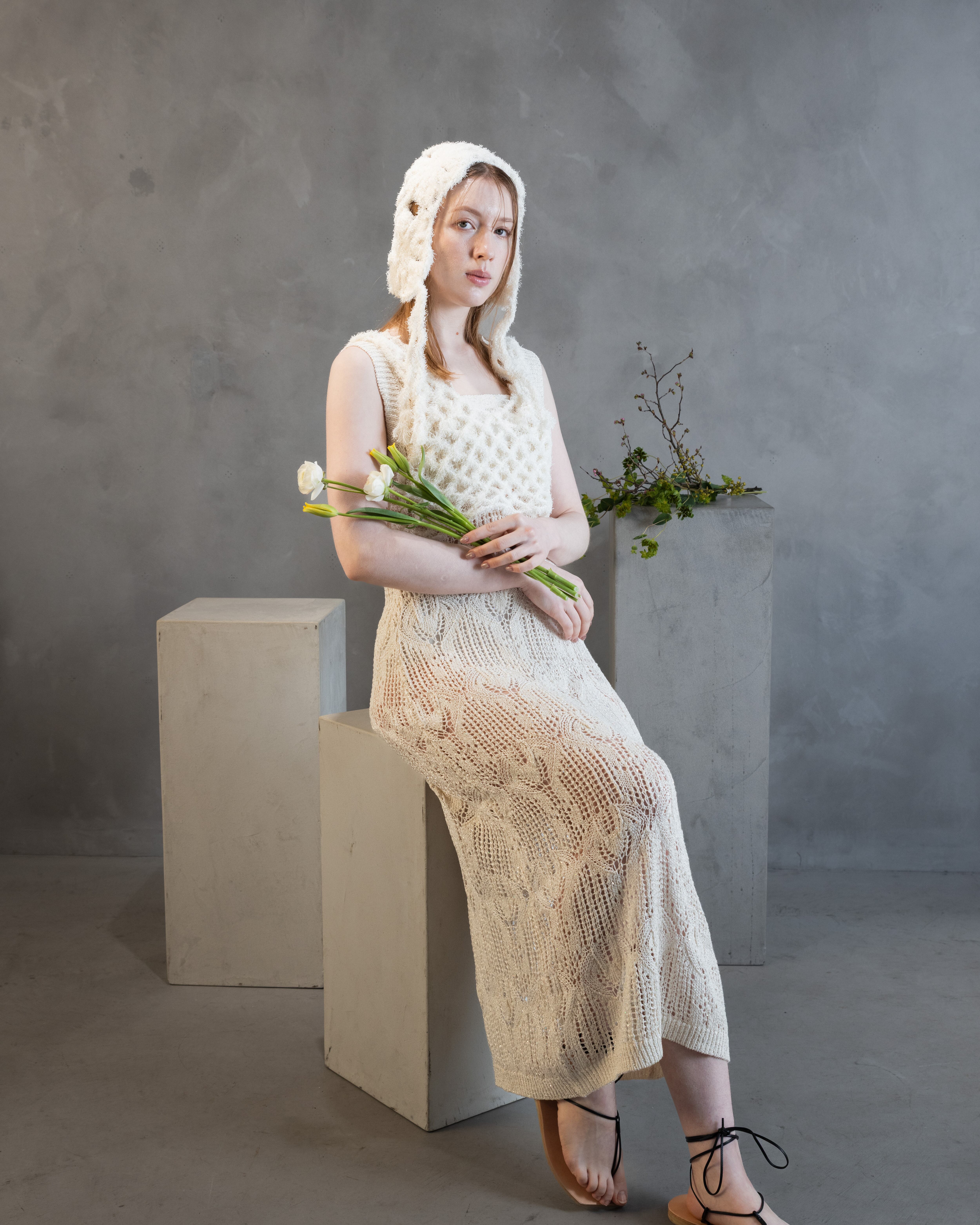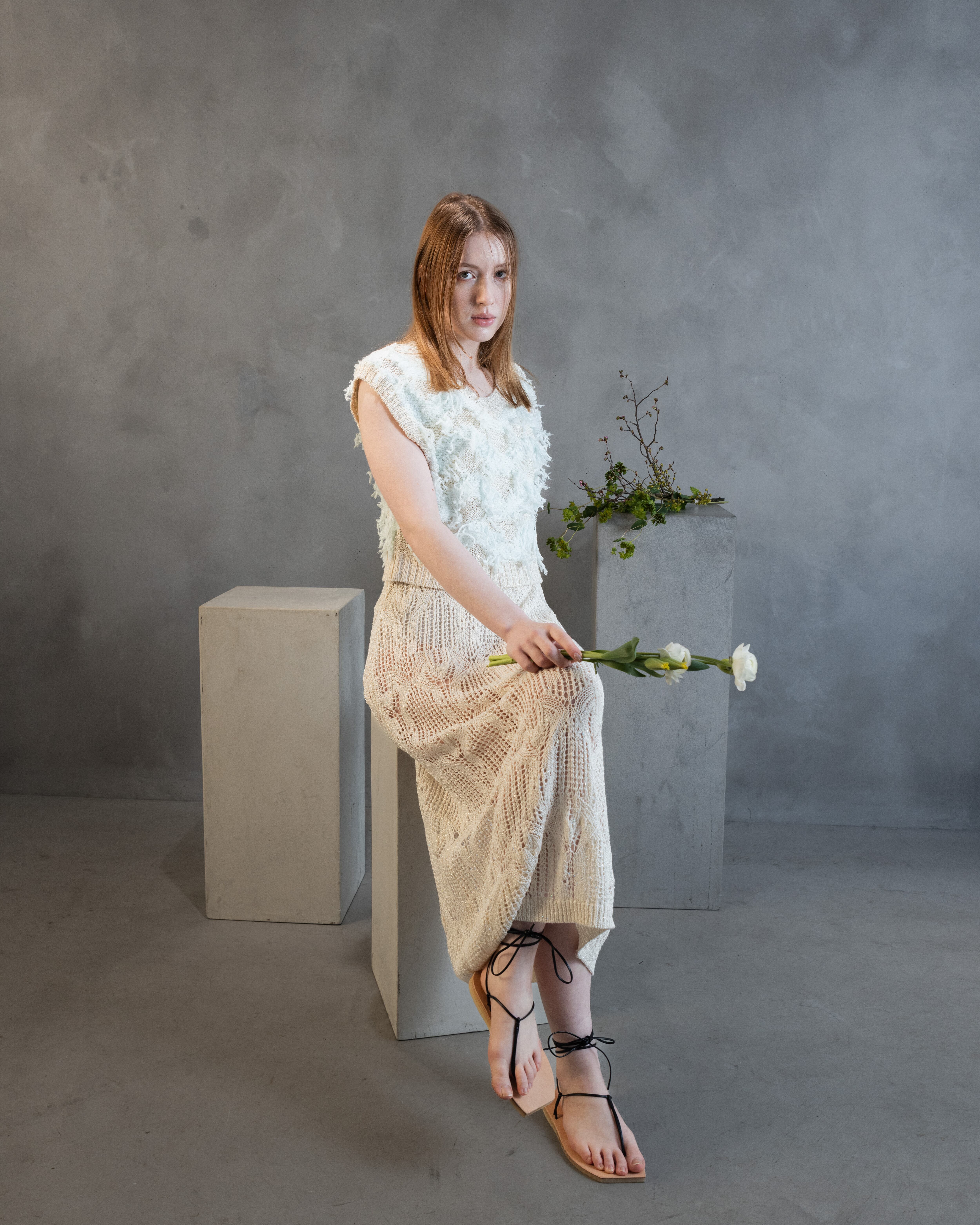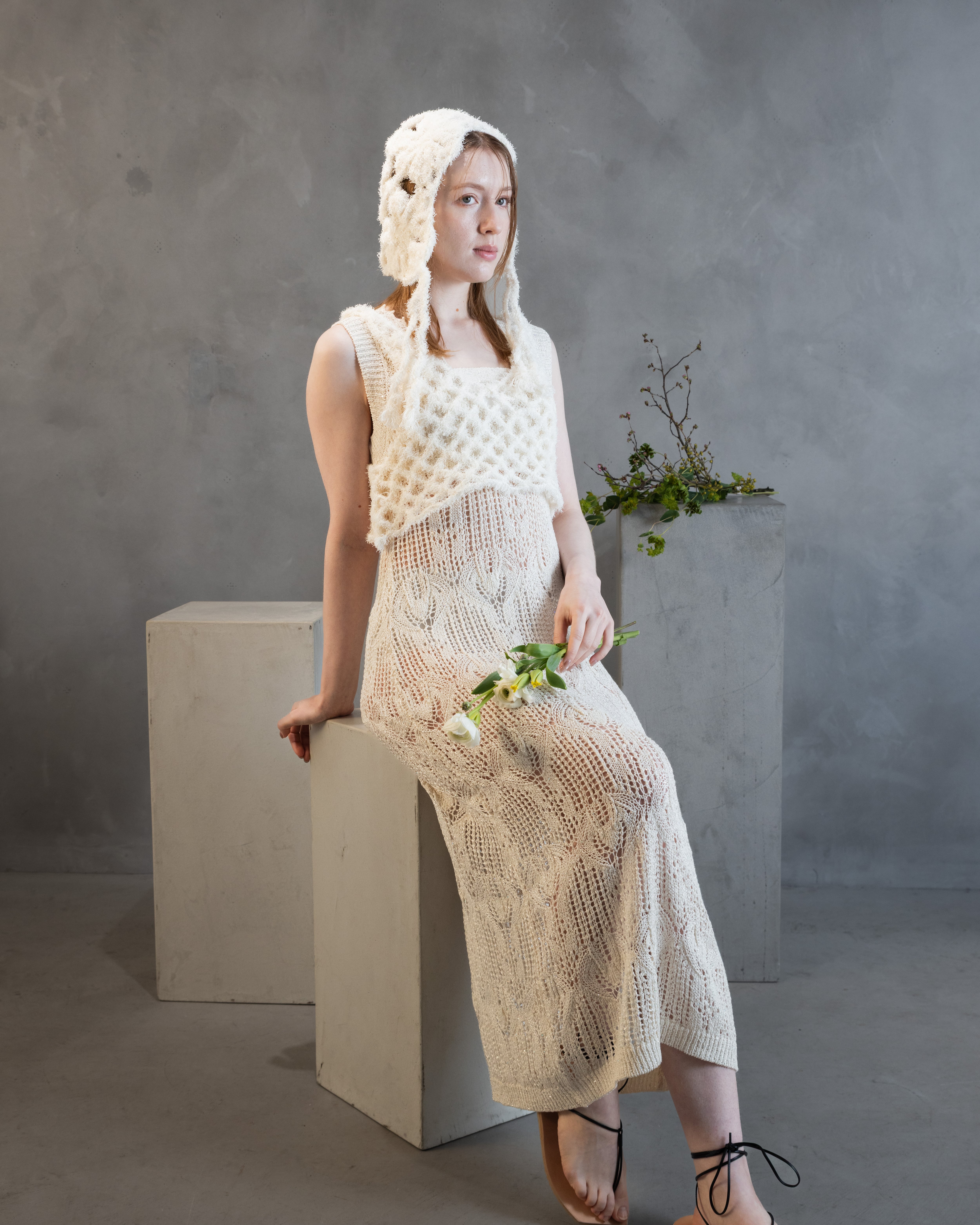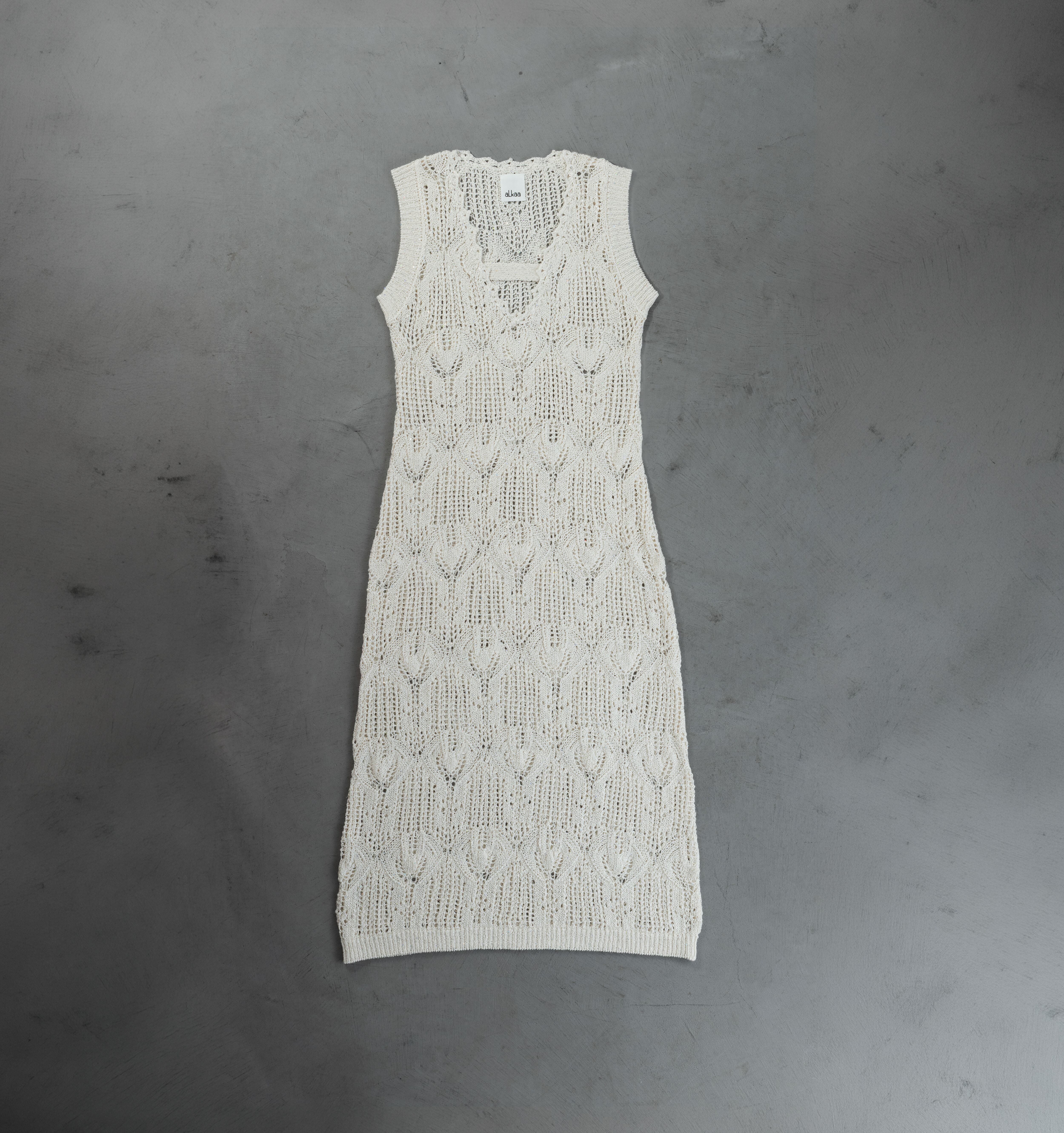 小さなスパンコールが撚りこまれたコットンのファンシーヤーンで、スカシ編みが夏らしいすっきりシルエットのワンピースを作りました。