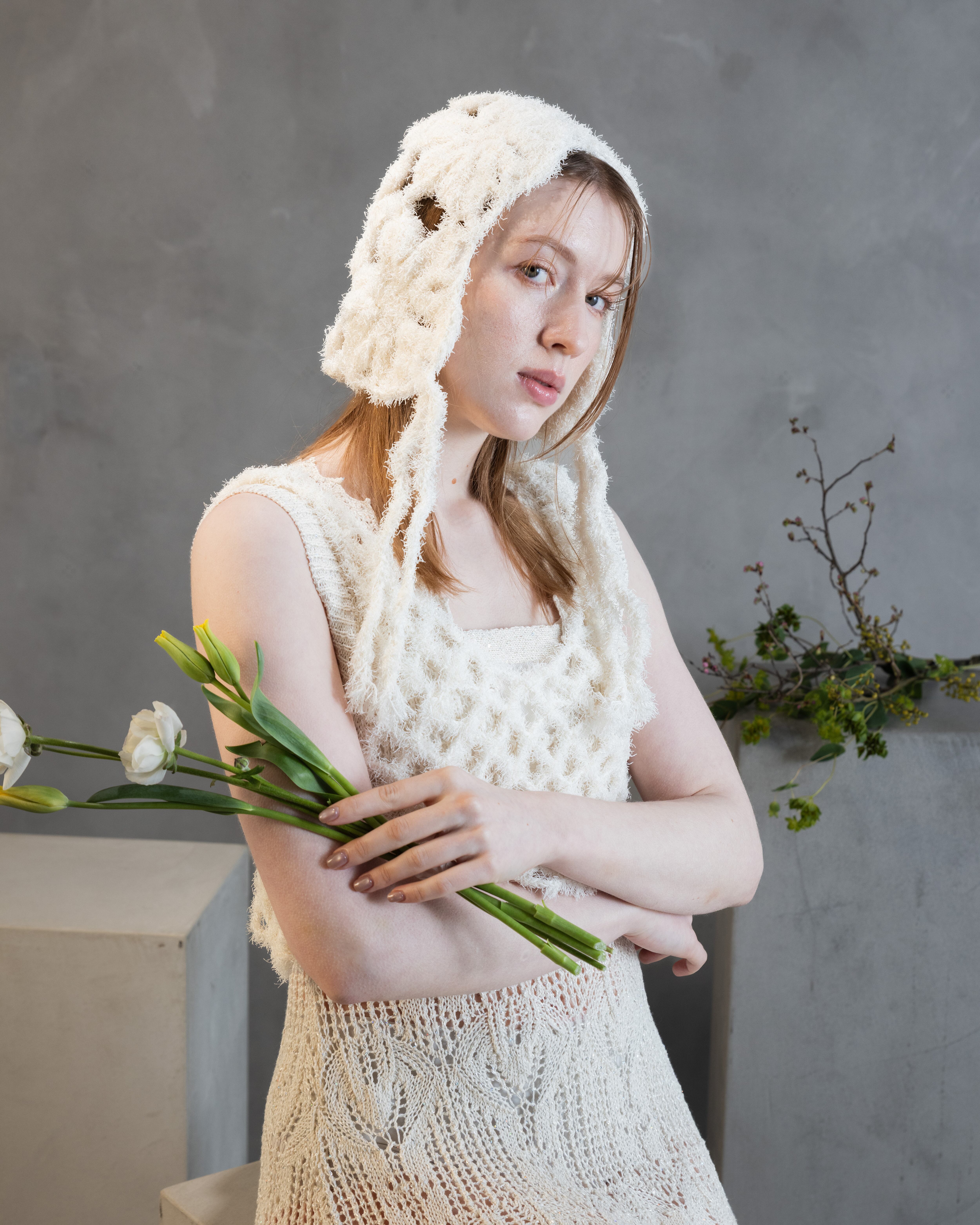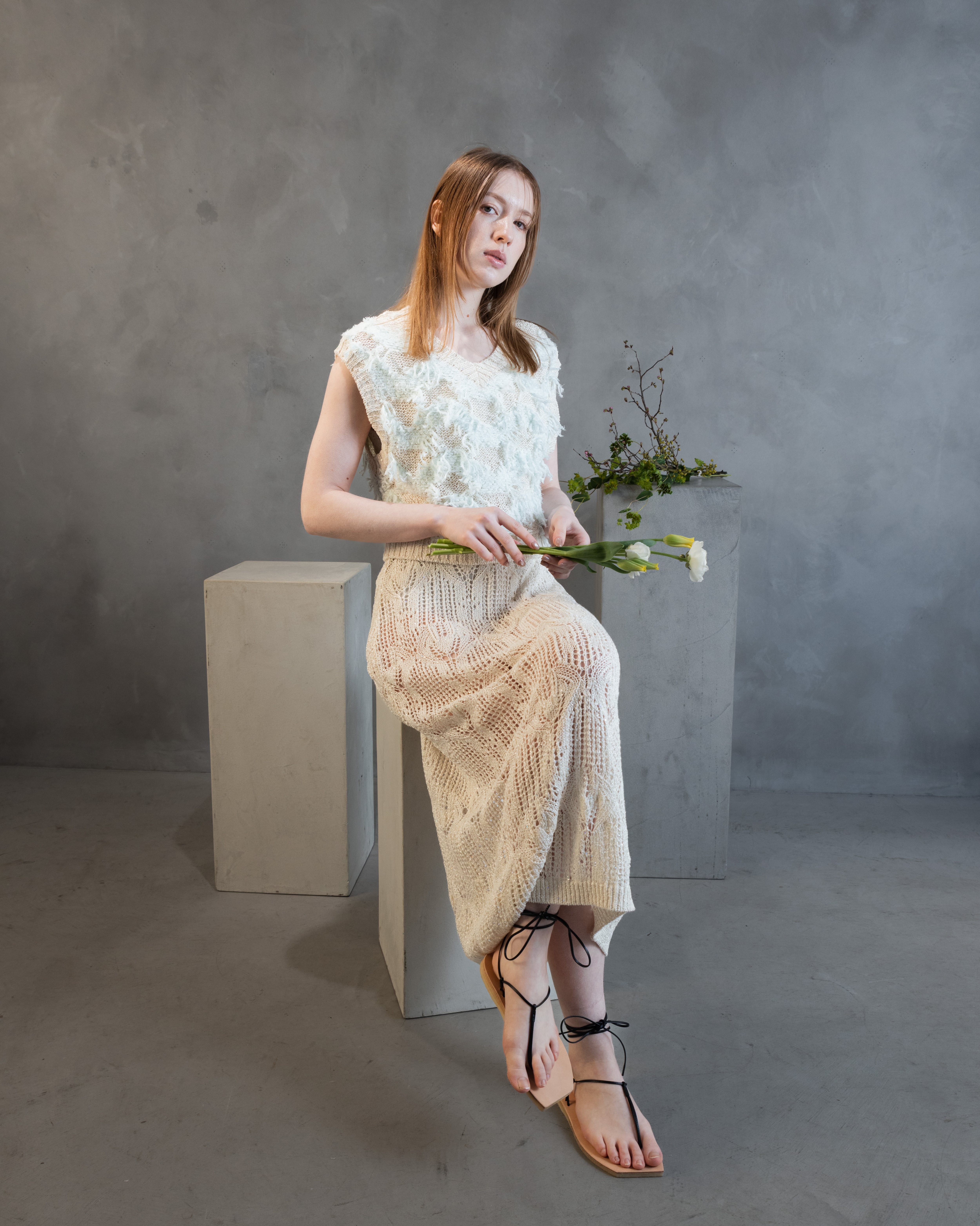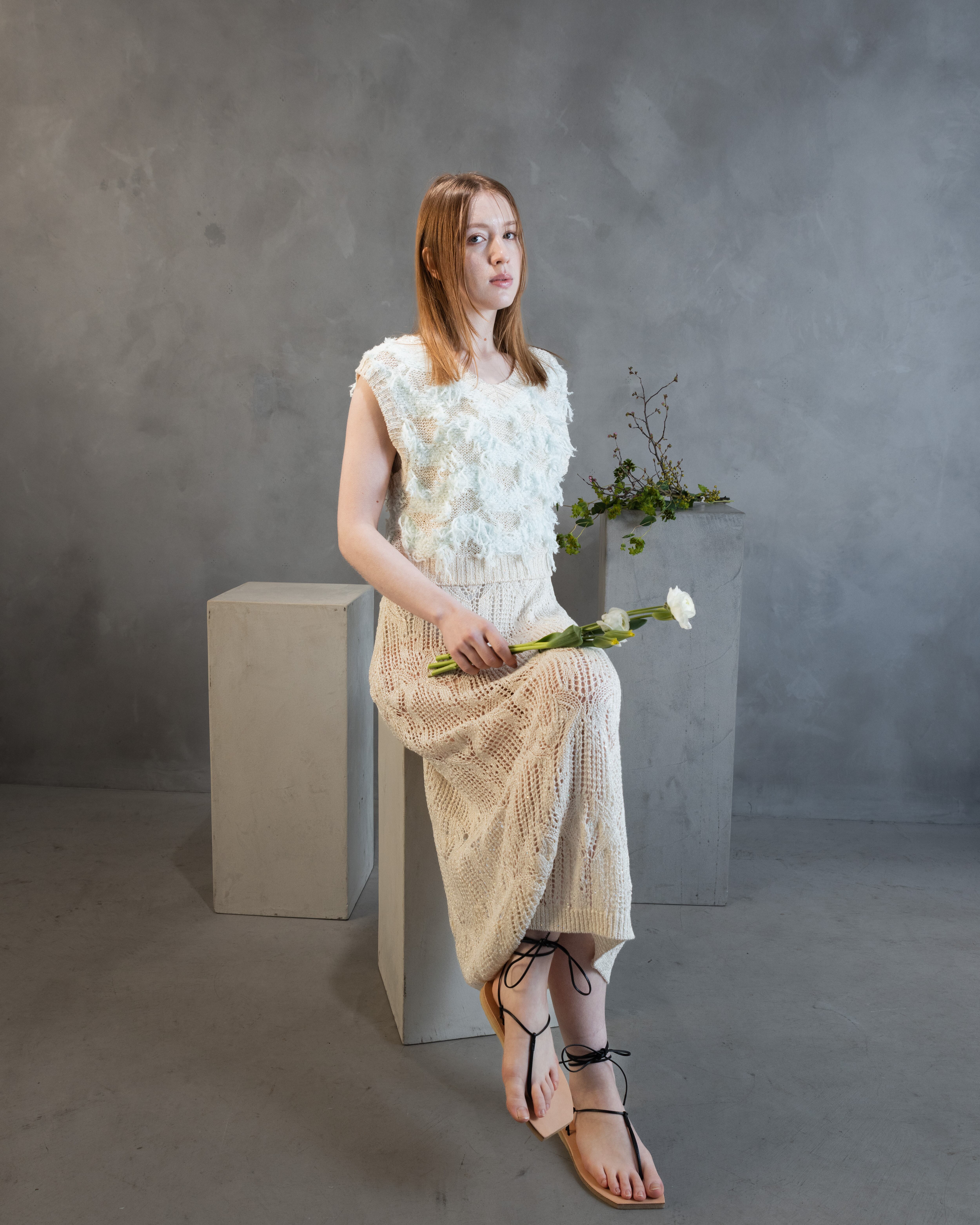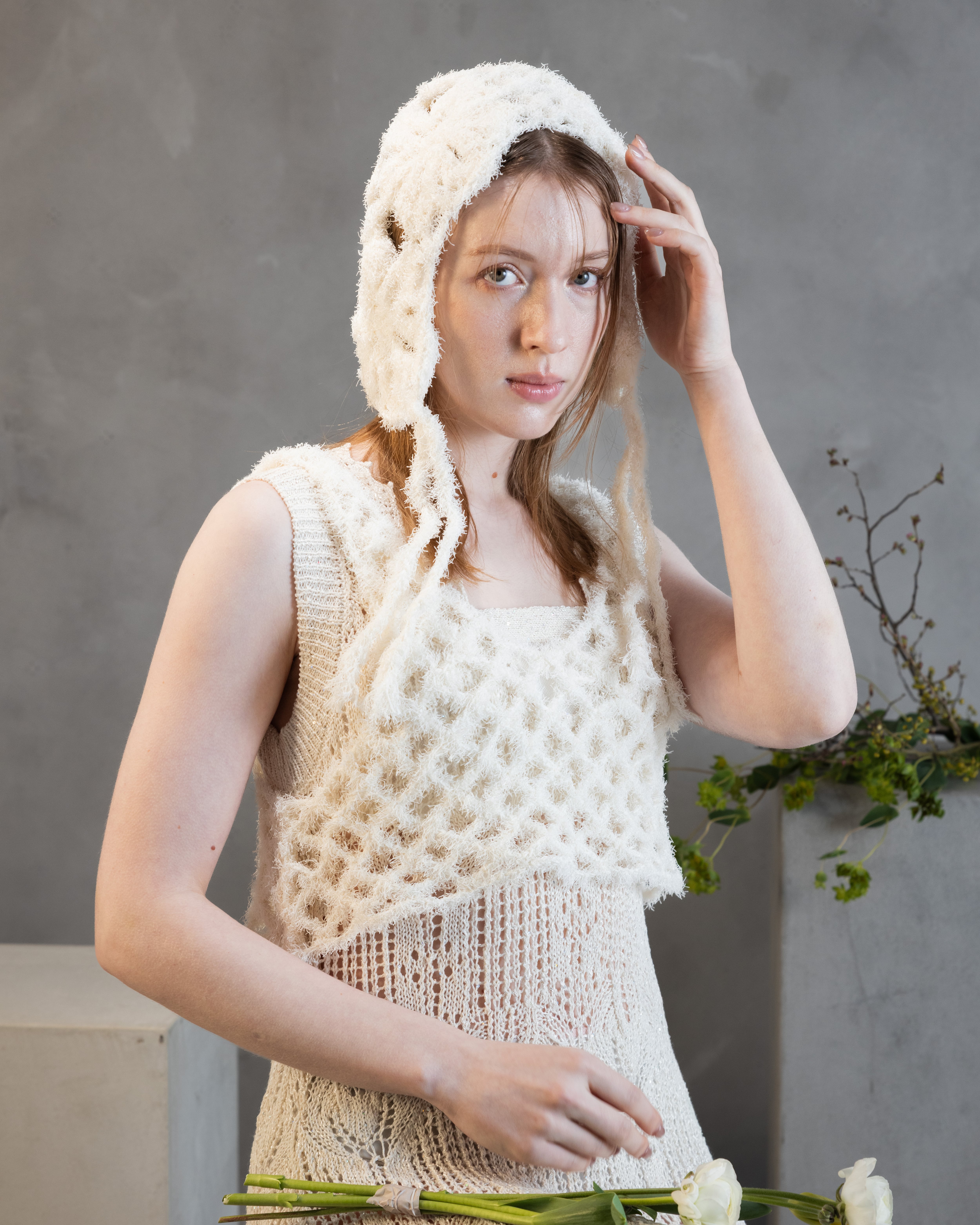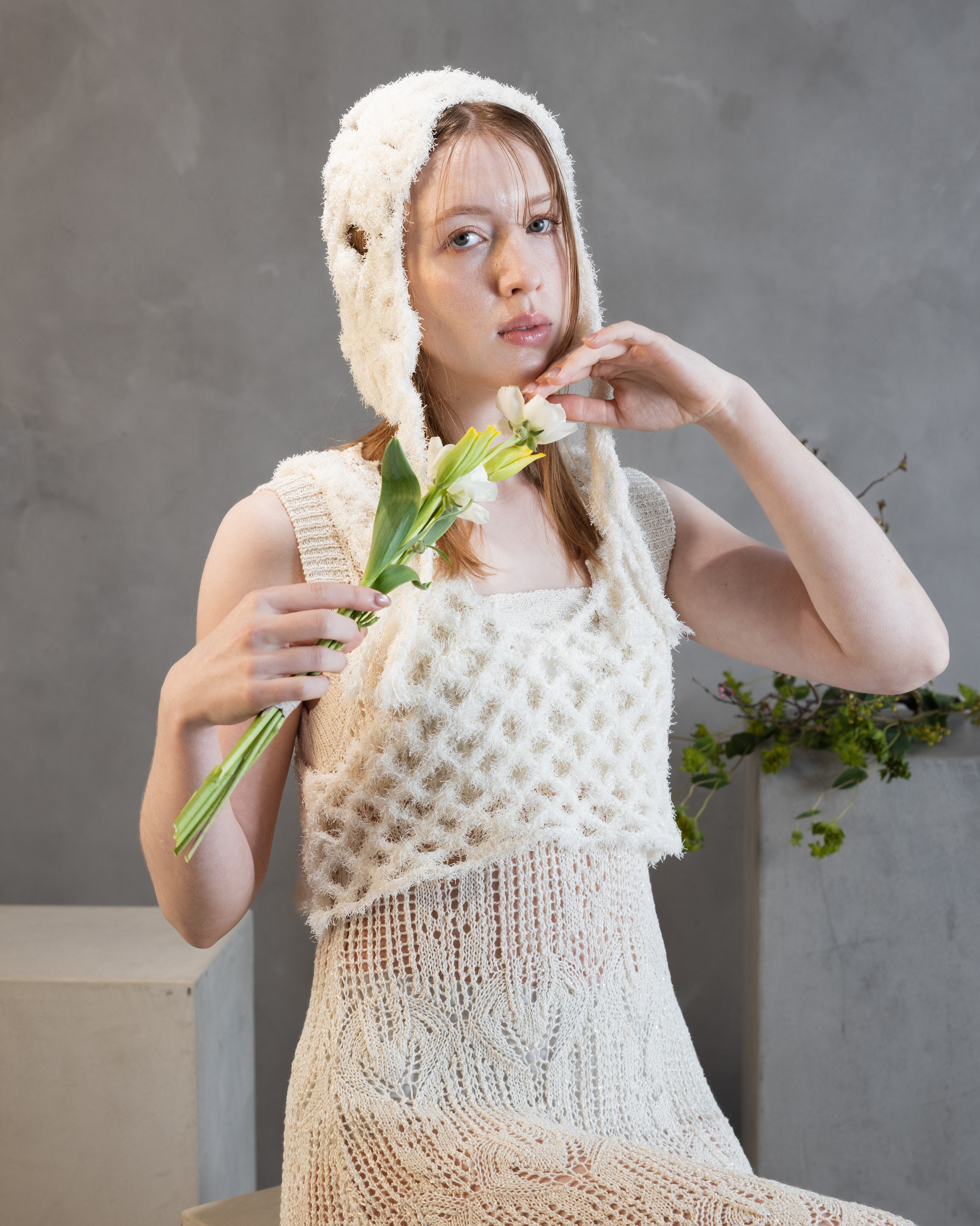 小さなスパンコールが撚りこまれたコットンのファンシーヤーンで、スカシ編みが夏らしいすっきりシルエットのワンピースを作りました。
