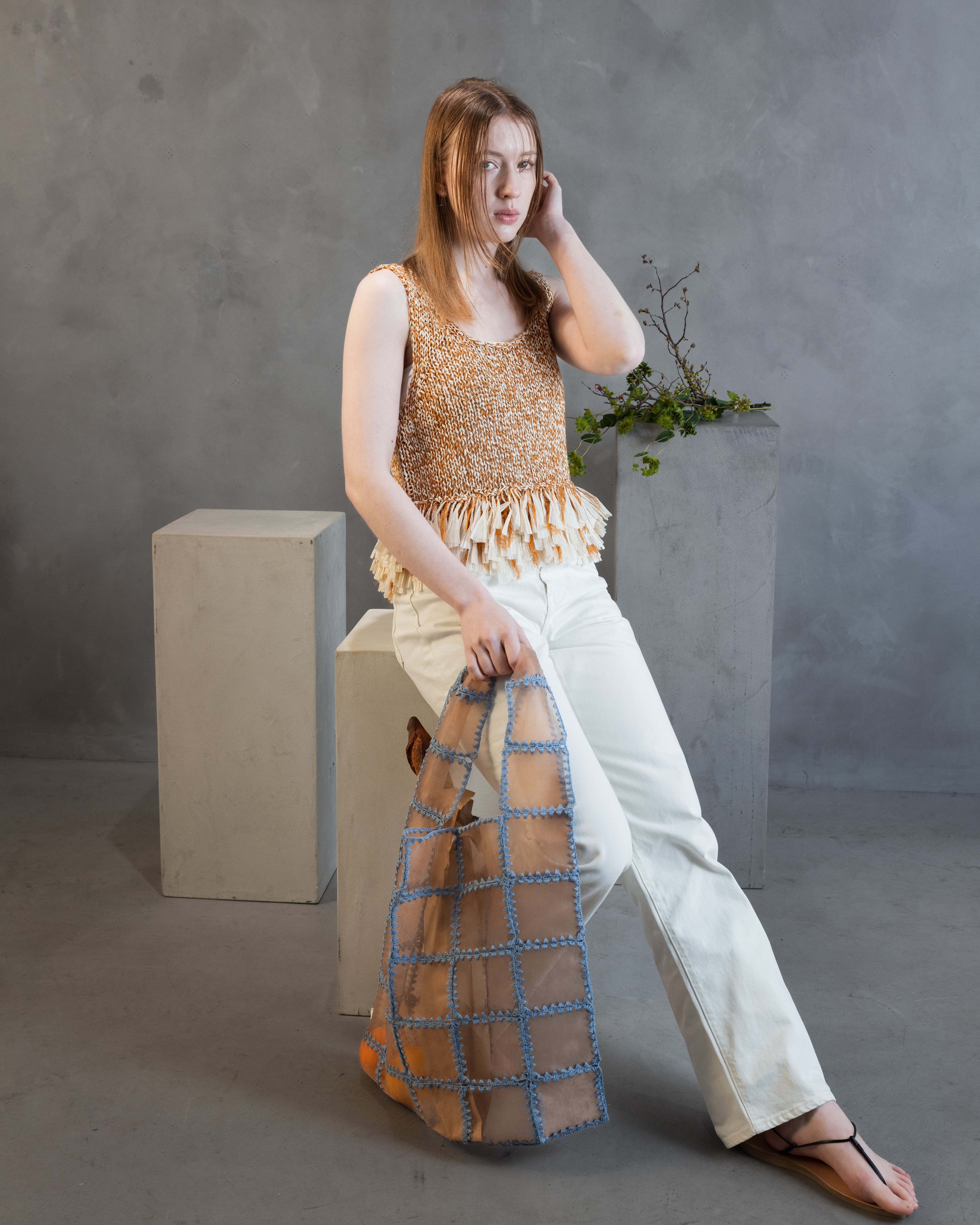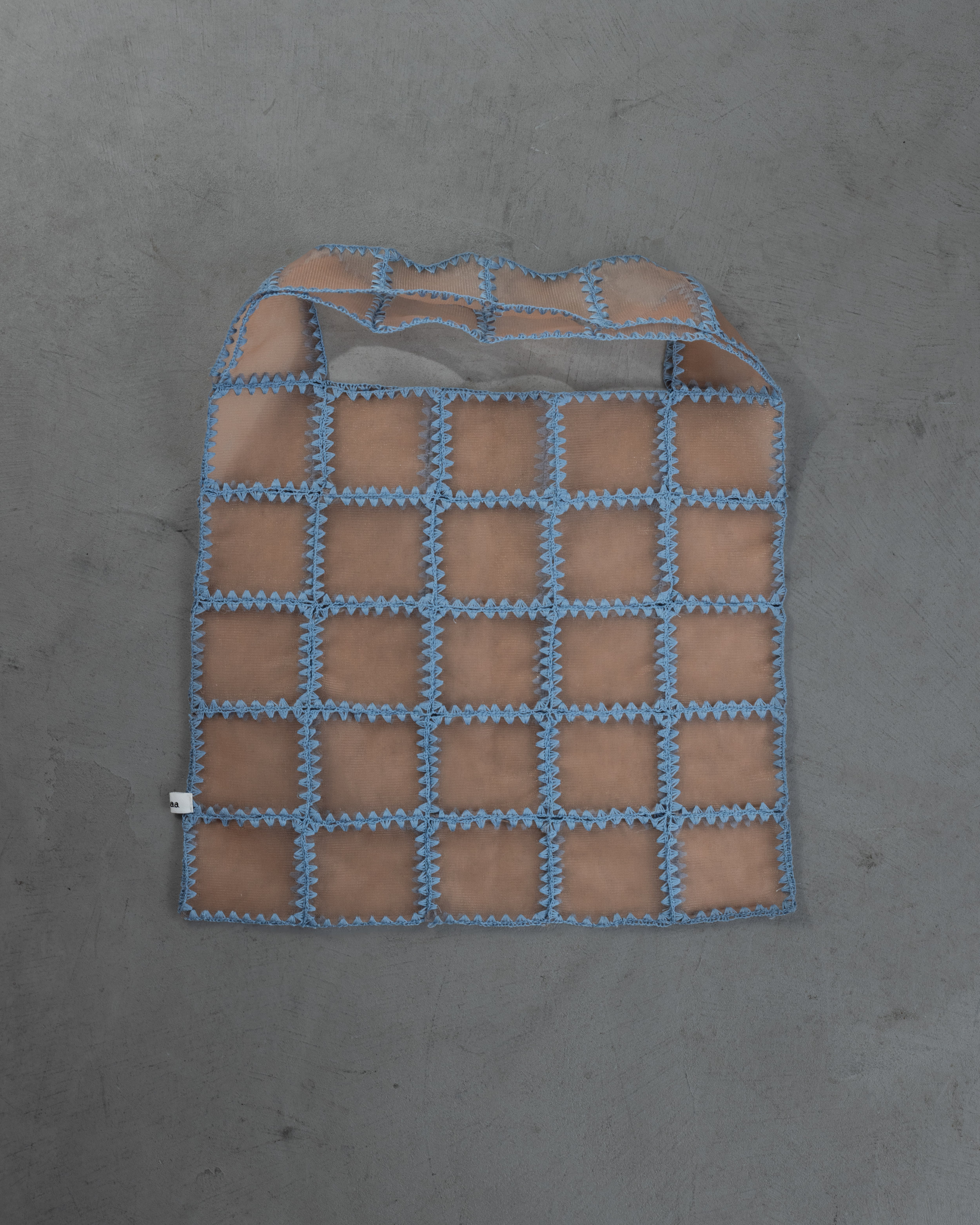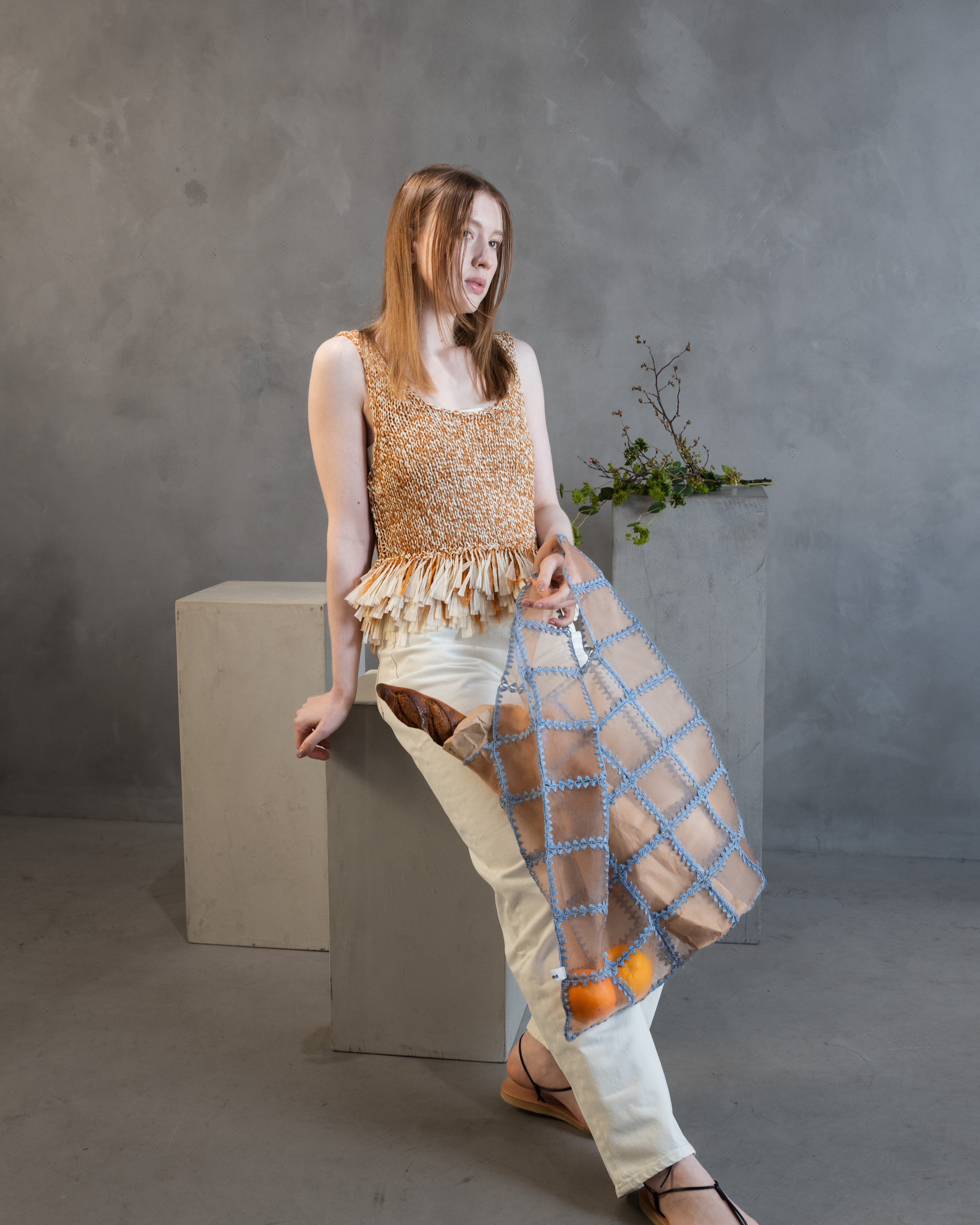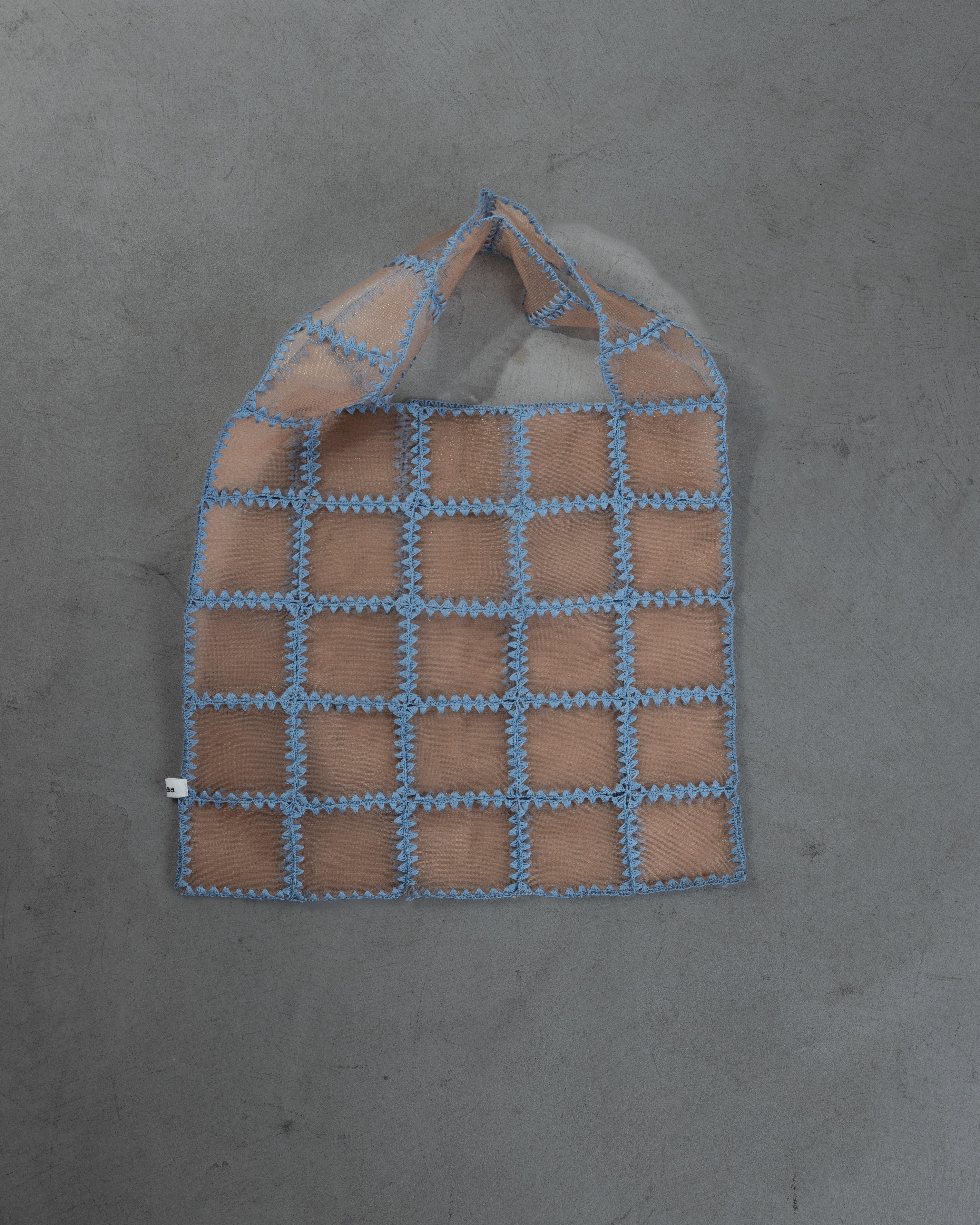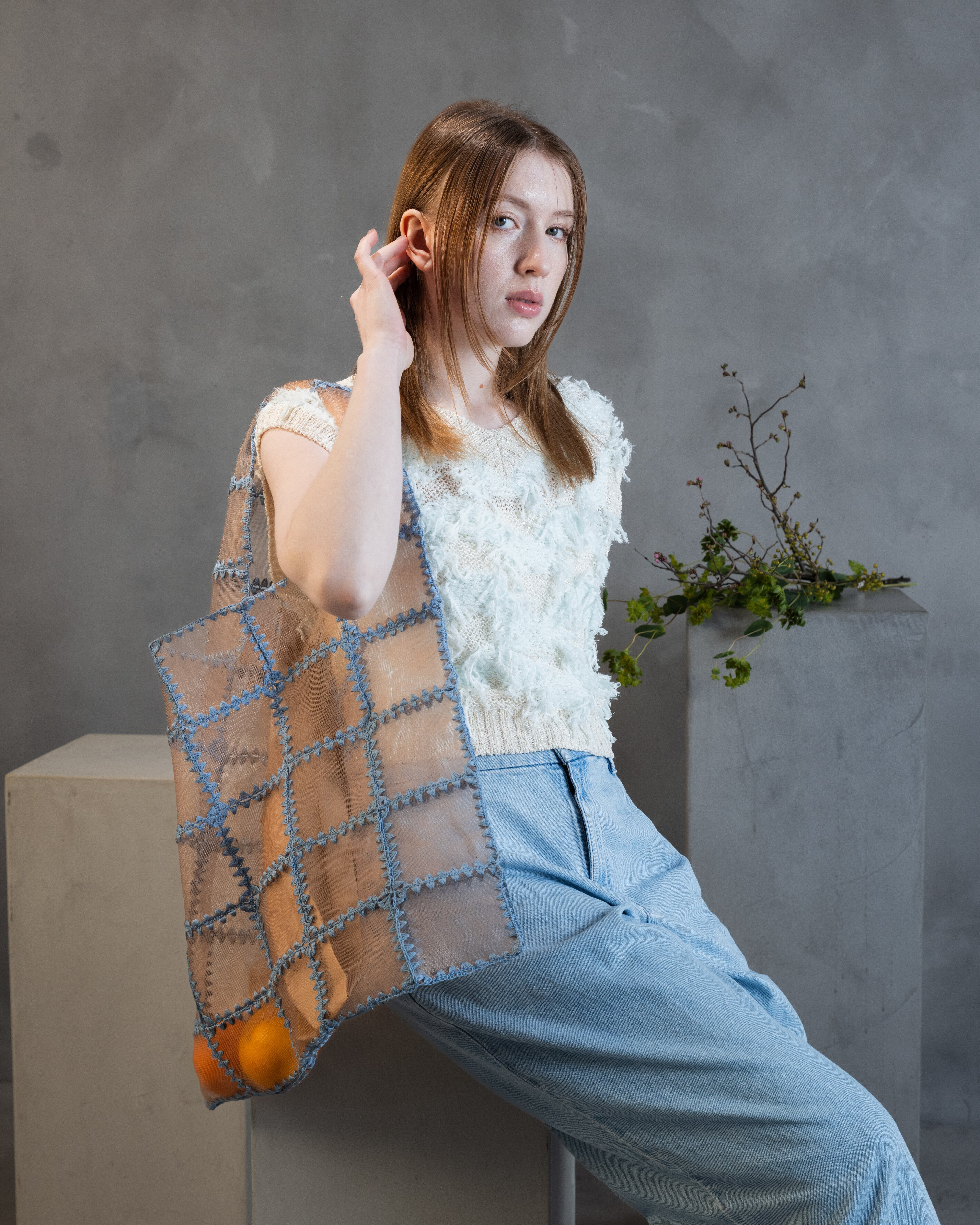 透明でハリのあるきれいな色のブロックを、さわやかなブルーの鈎針編みでひと針ひと針繋ぎ合わせ、クラフト感たっぷりのトートBAGを作りました。