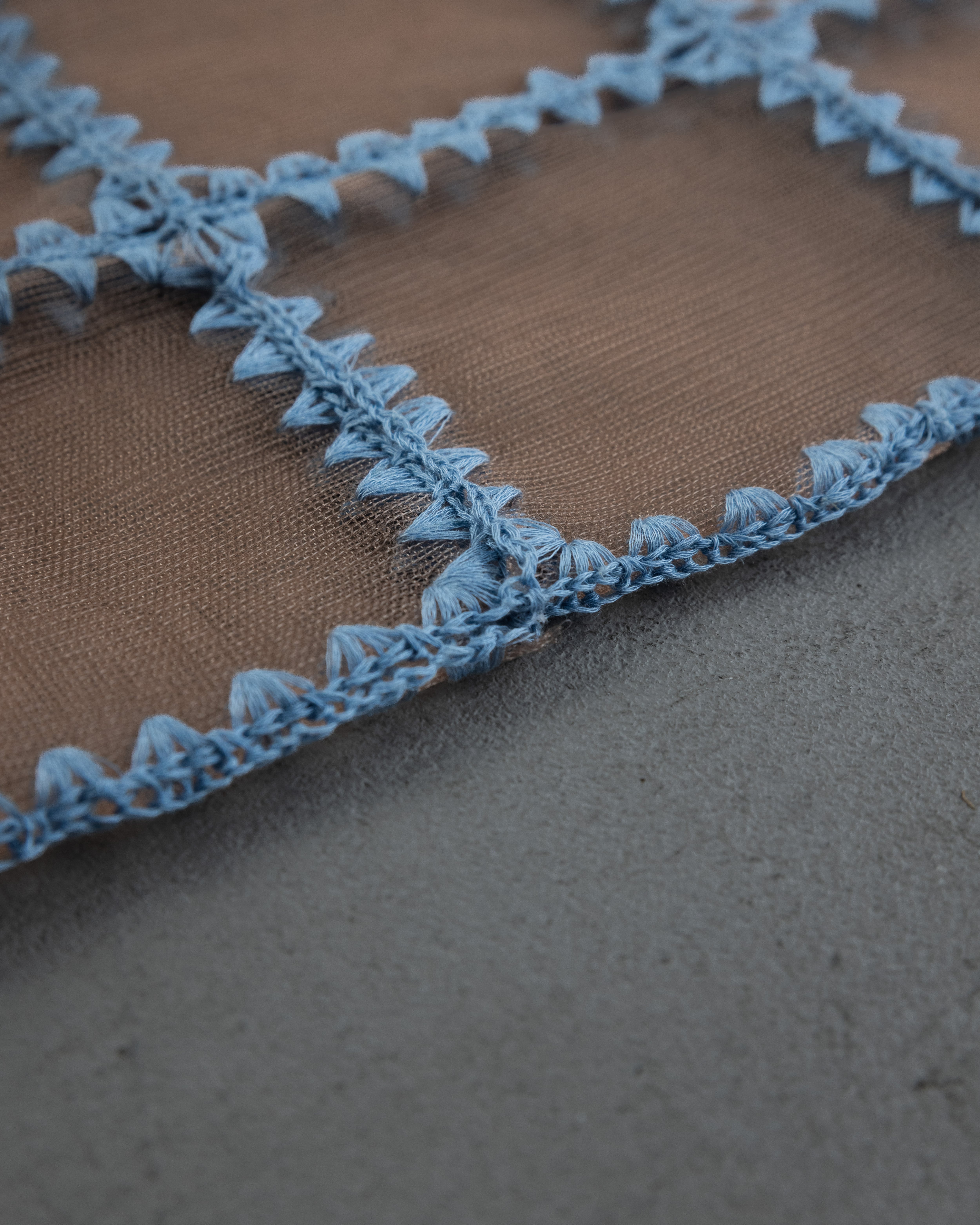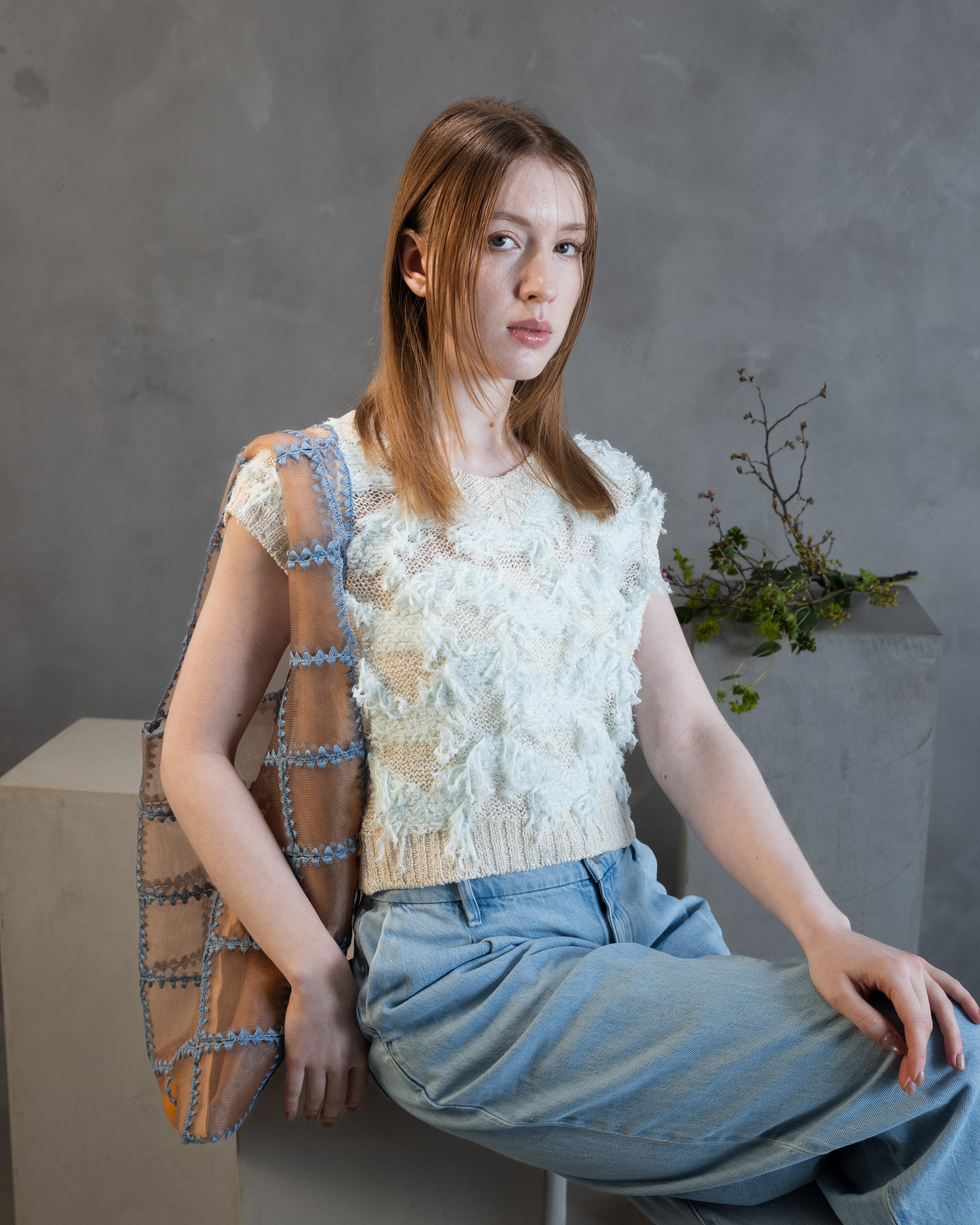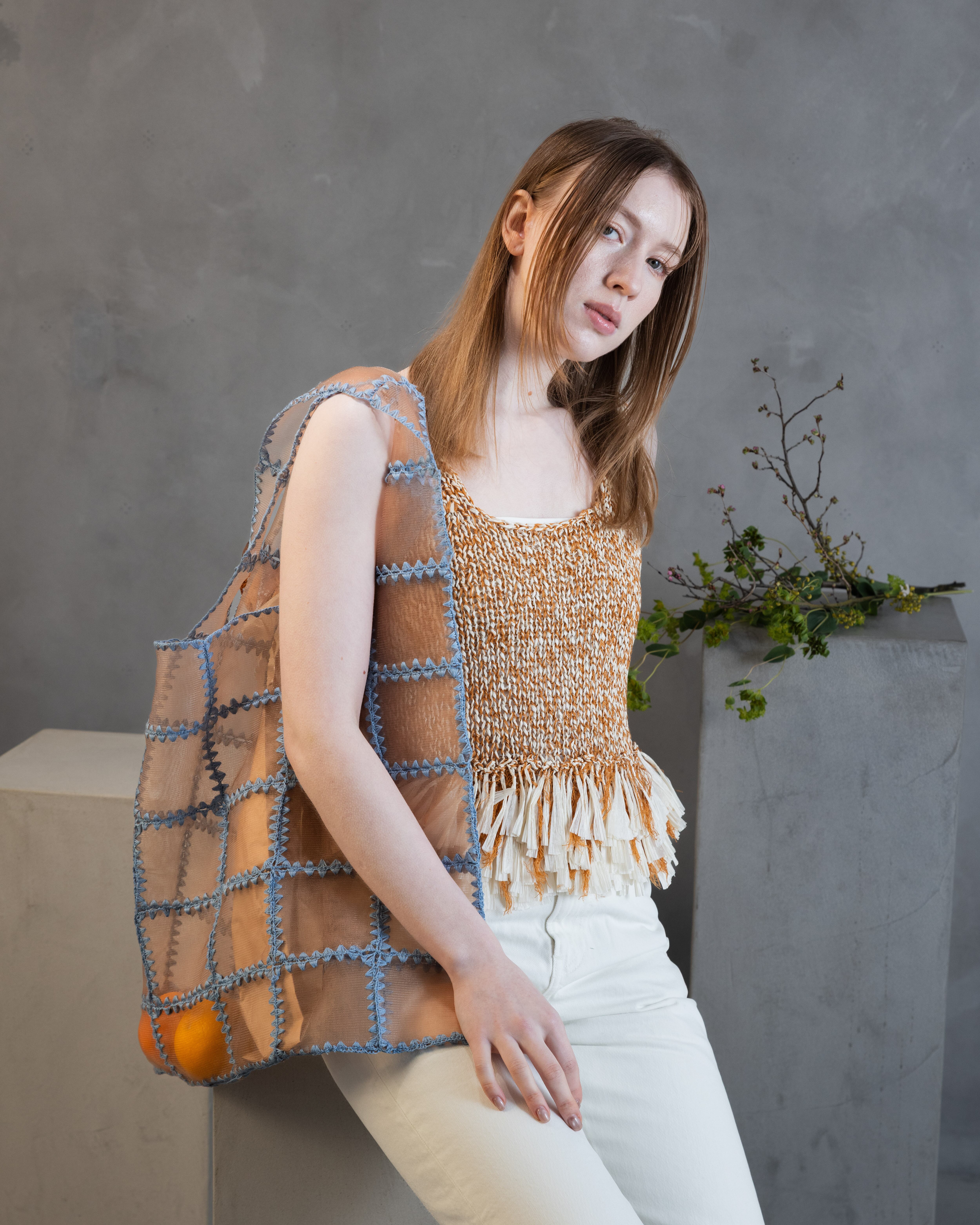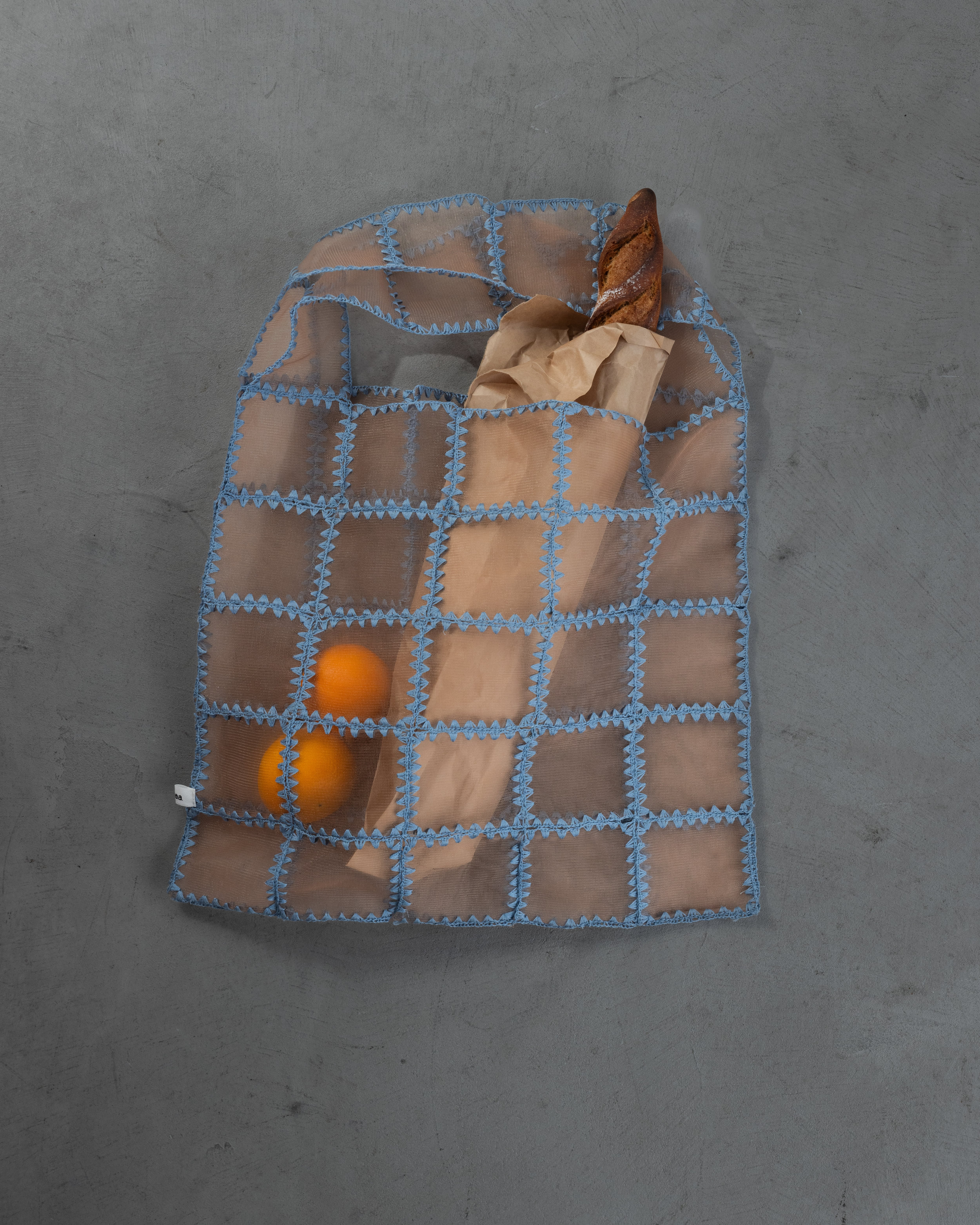 透明でハリのあるきれいな色のブロックを、さわやかなブルーの鈎針編みでひと針ひと針繋ぎ合わせ、クラフト感たっぷりのトートBAGを作りました。