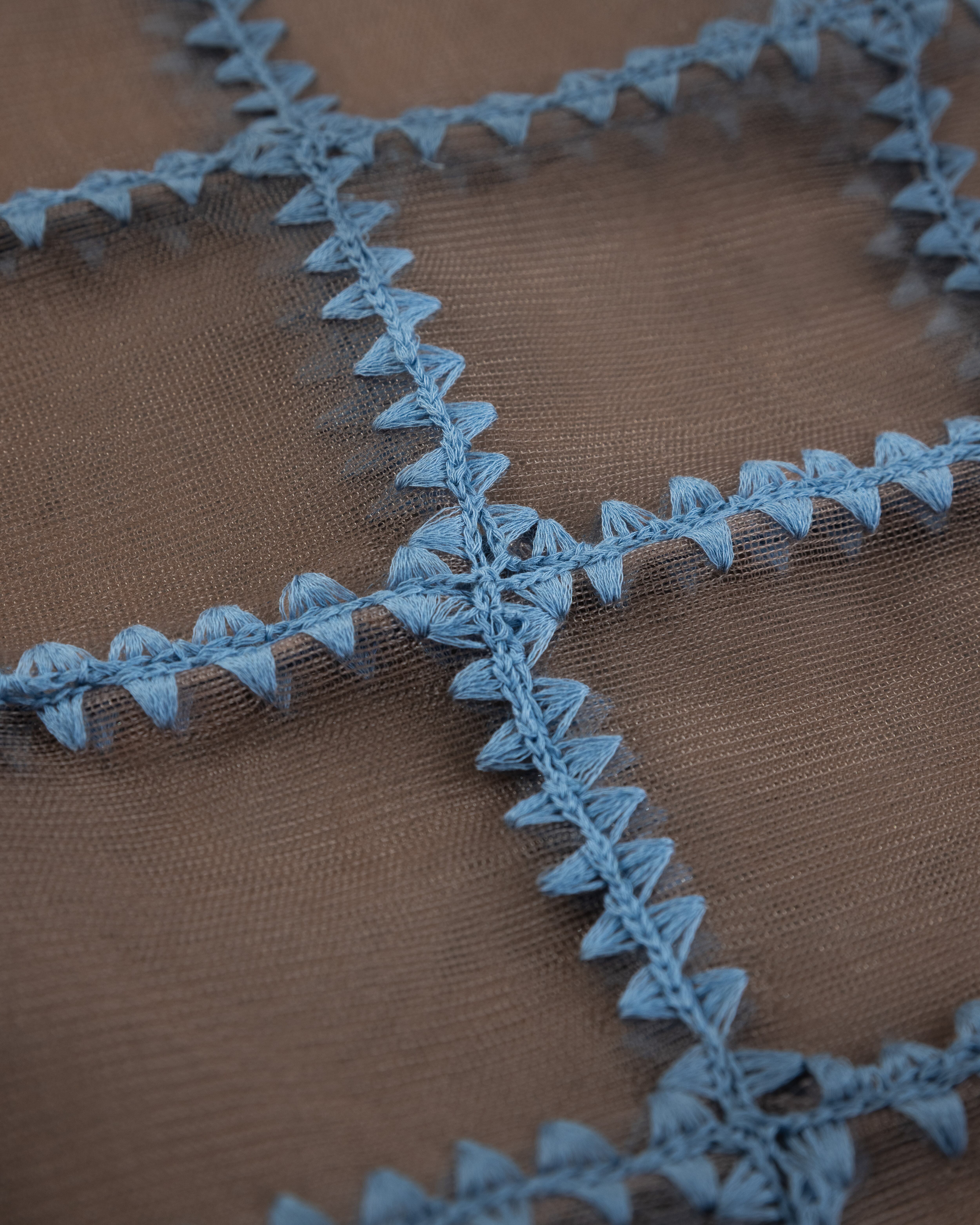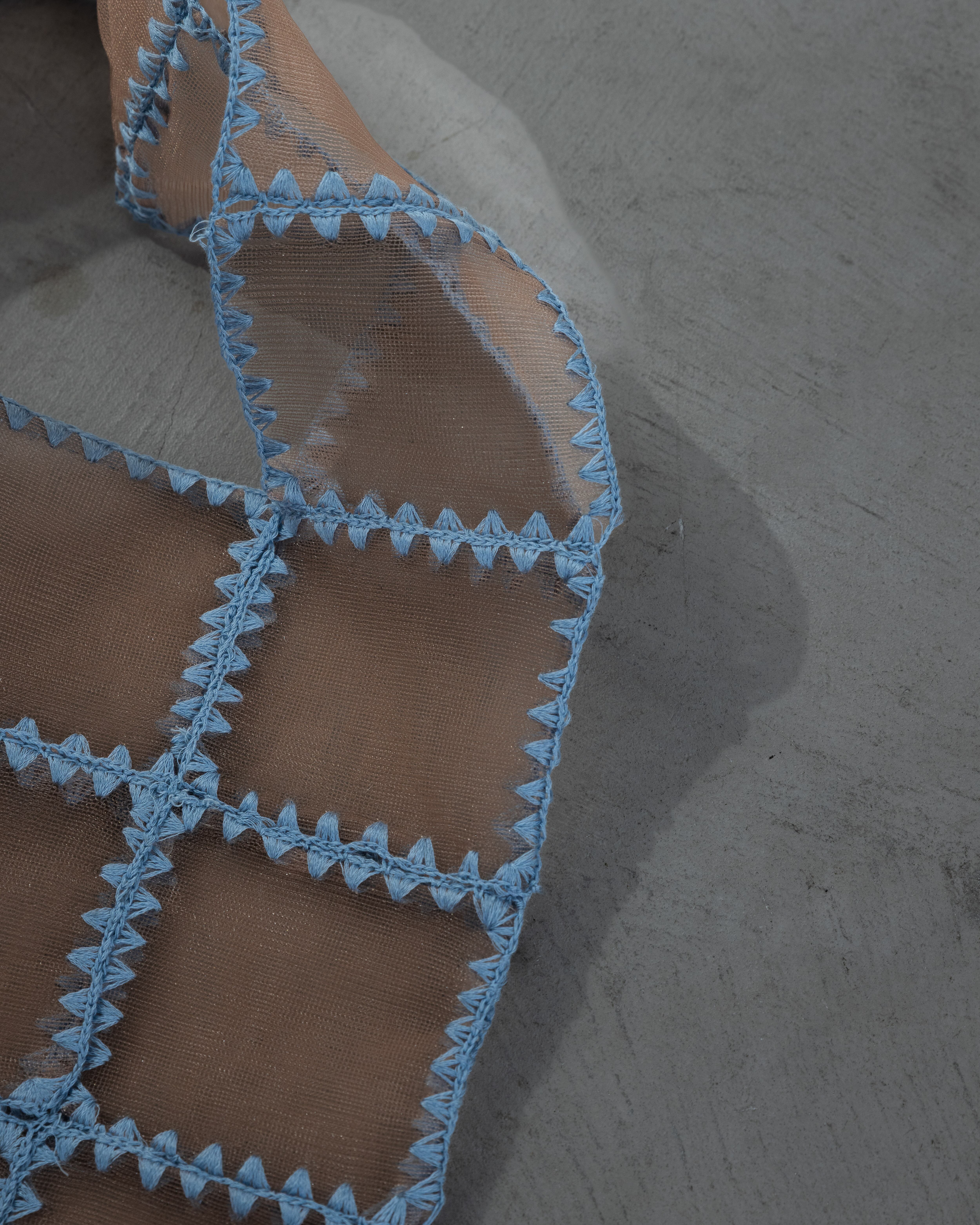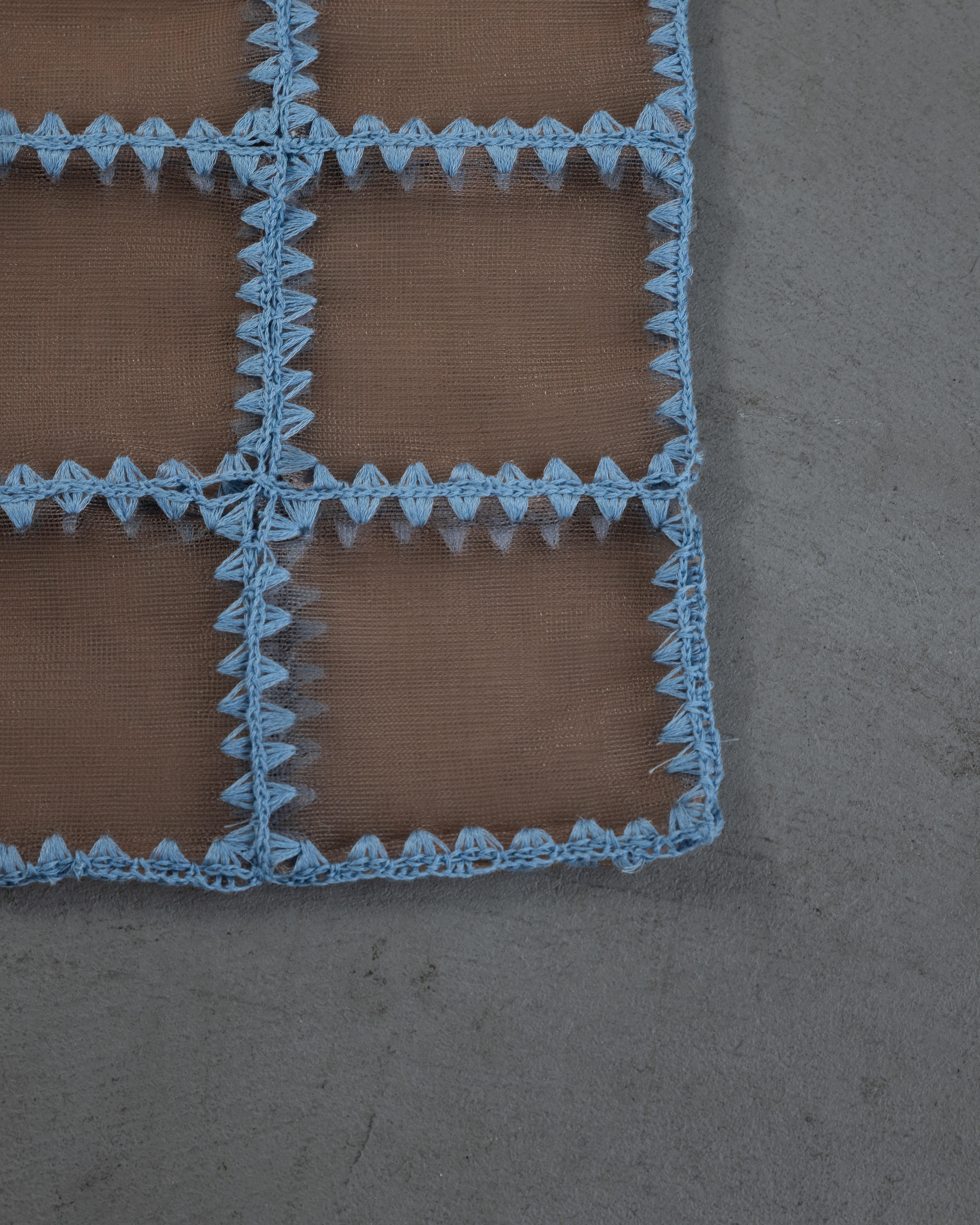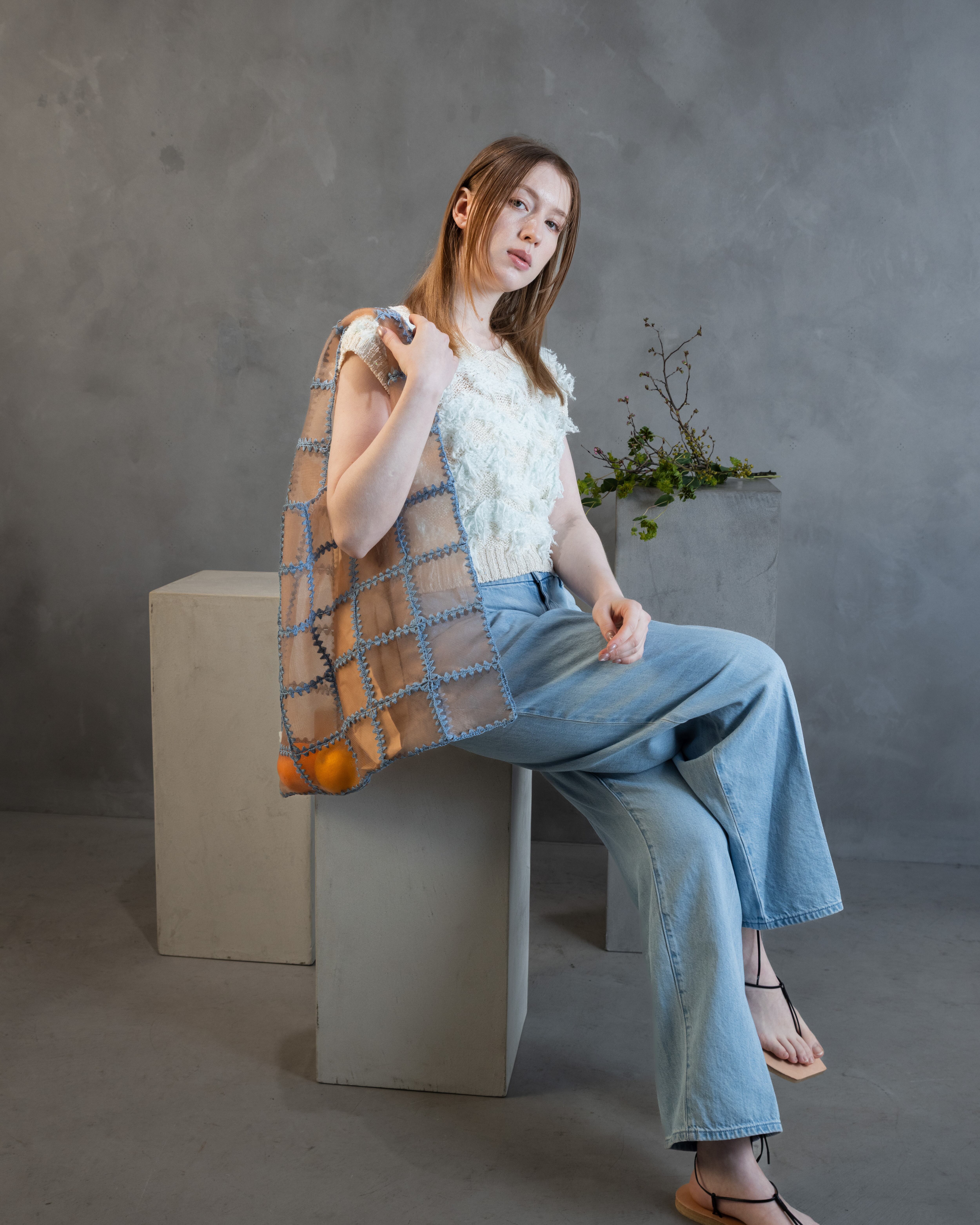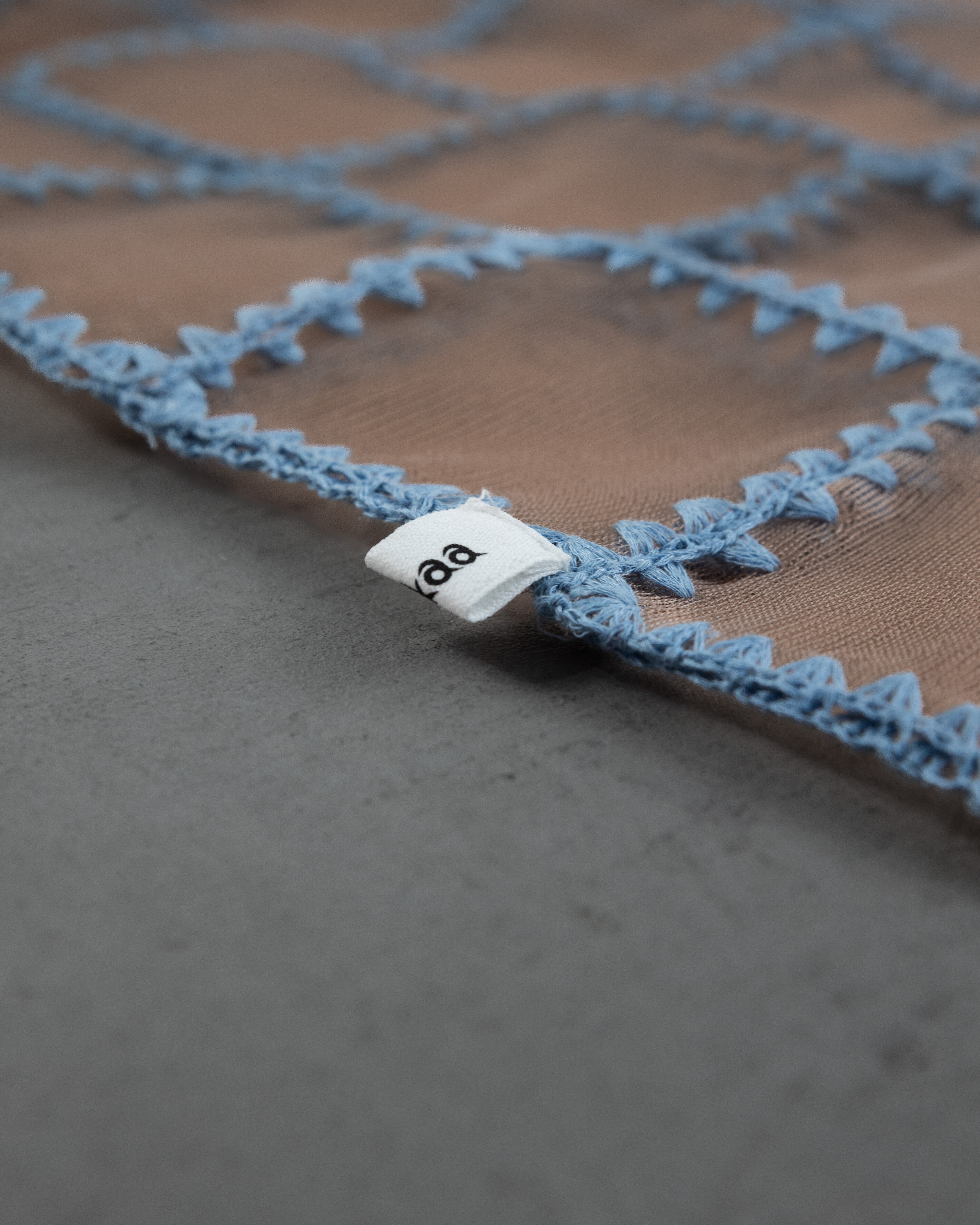 透明でハリのあるきれいな色のブロックを、さわやかなブルーの鈎針編みでひと針ひと針繋ぎ合わせ、クラフト感たっぷりのトートBAGを作りました。