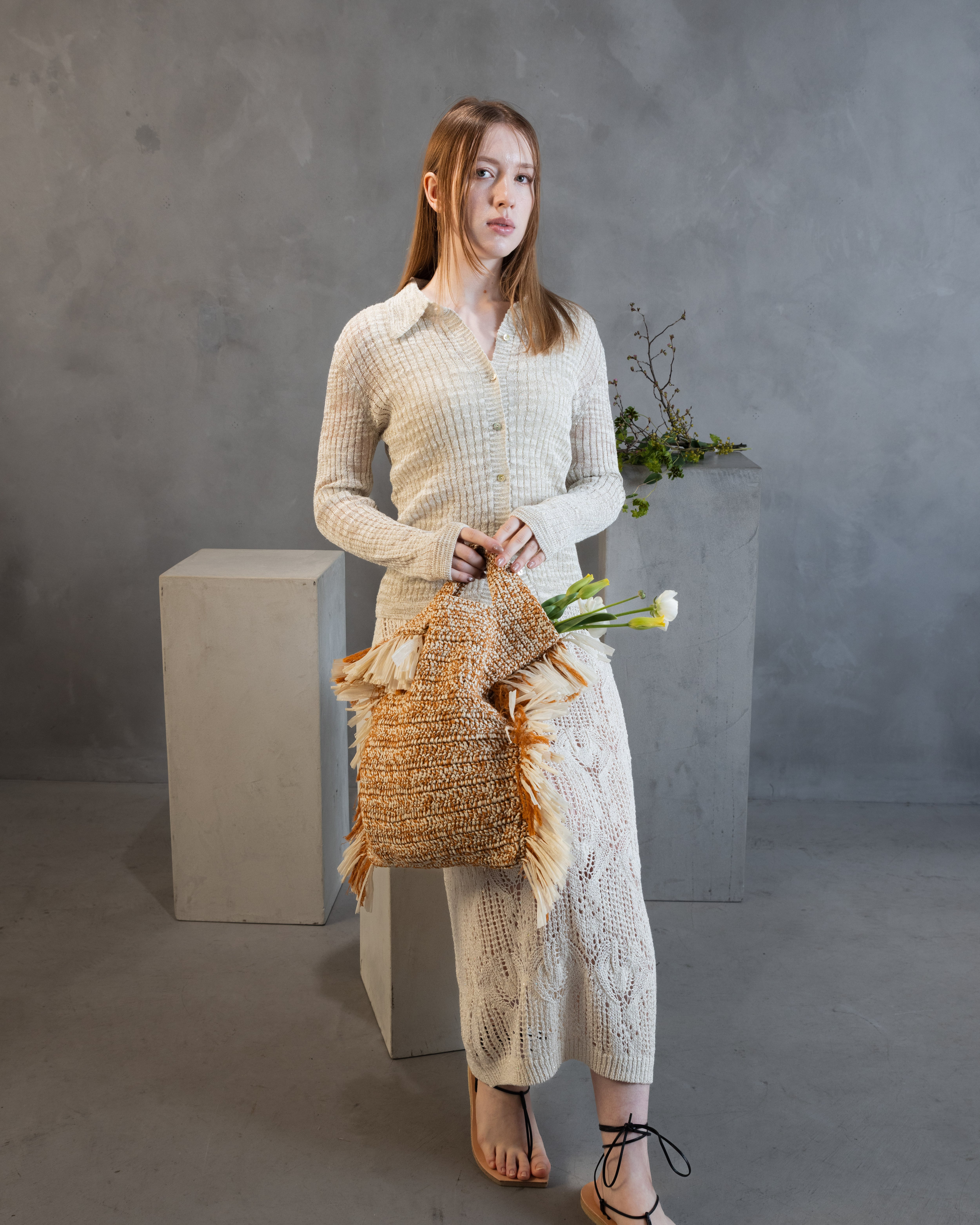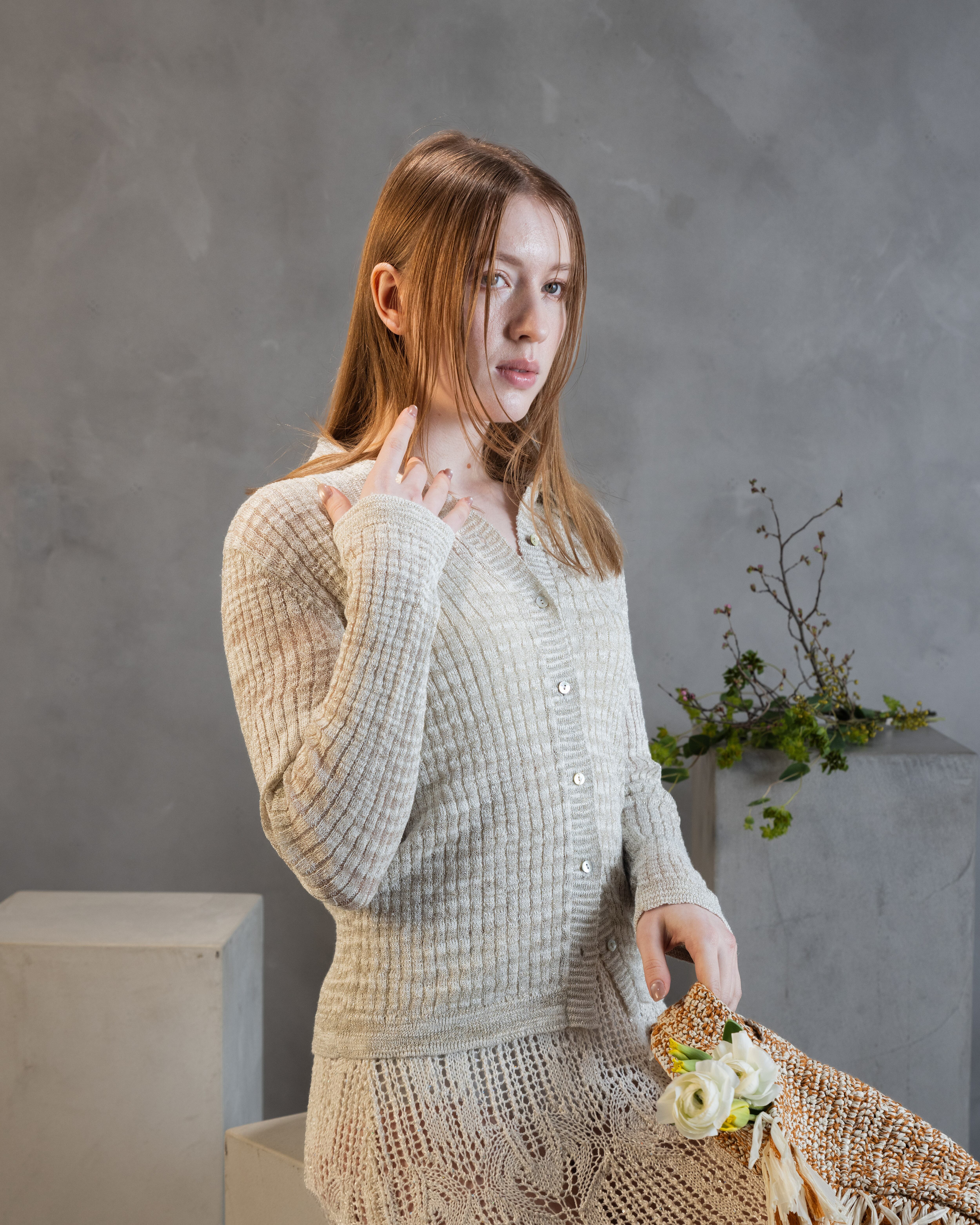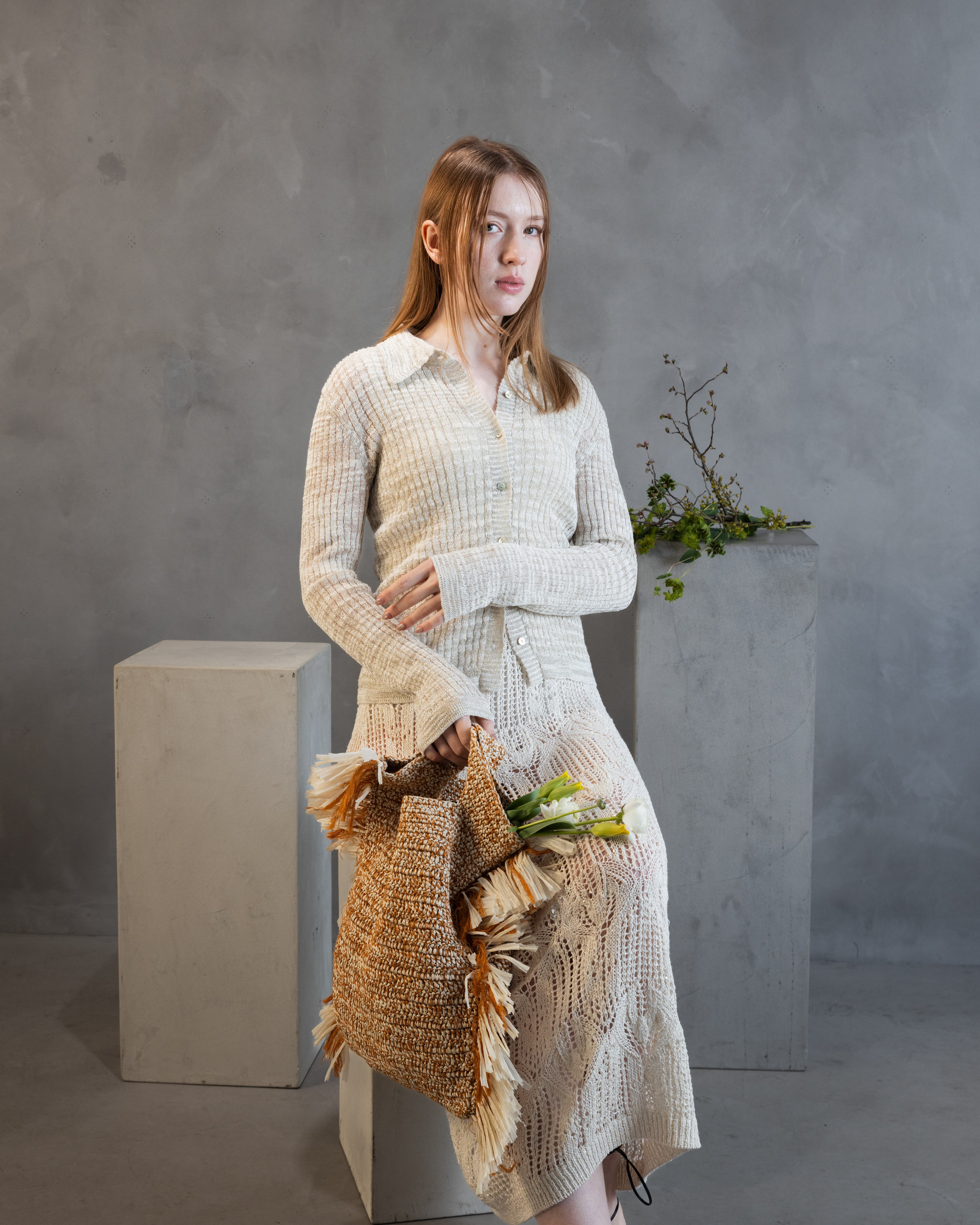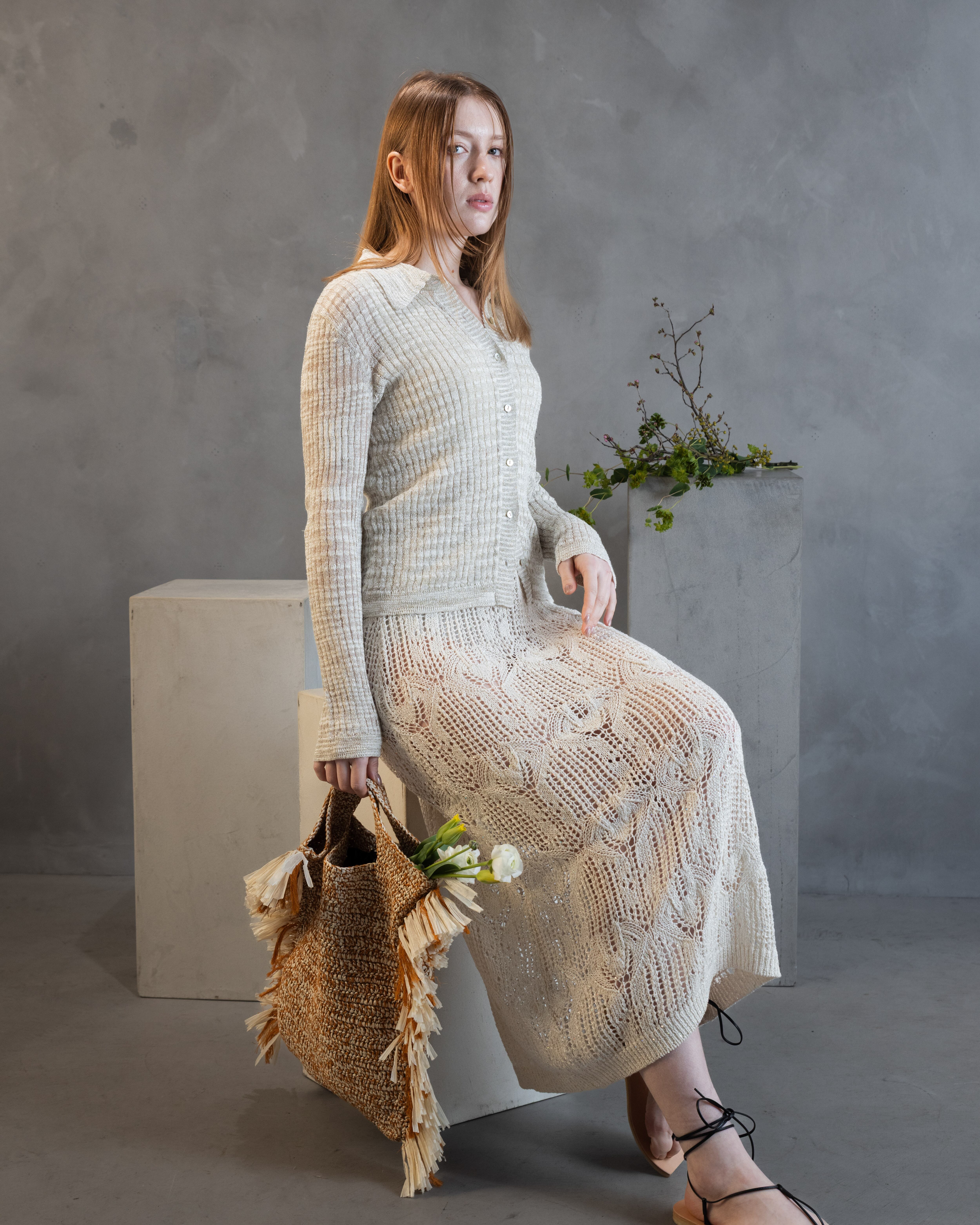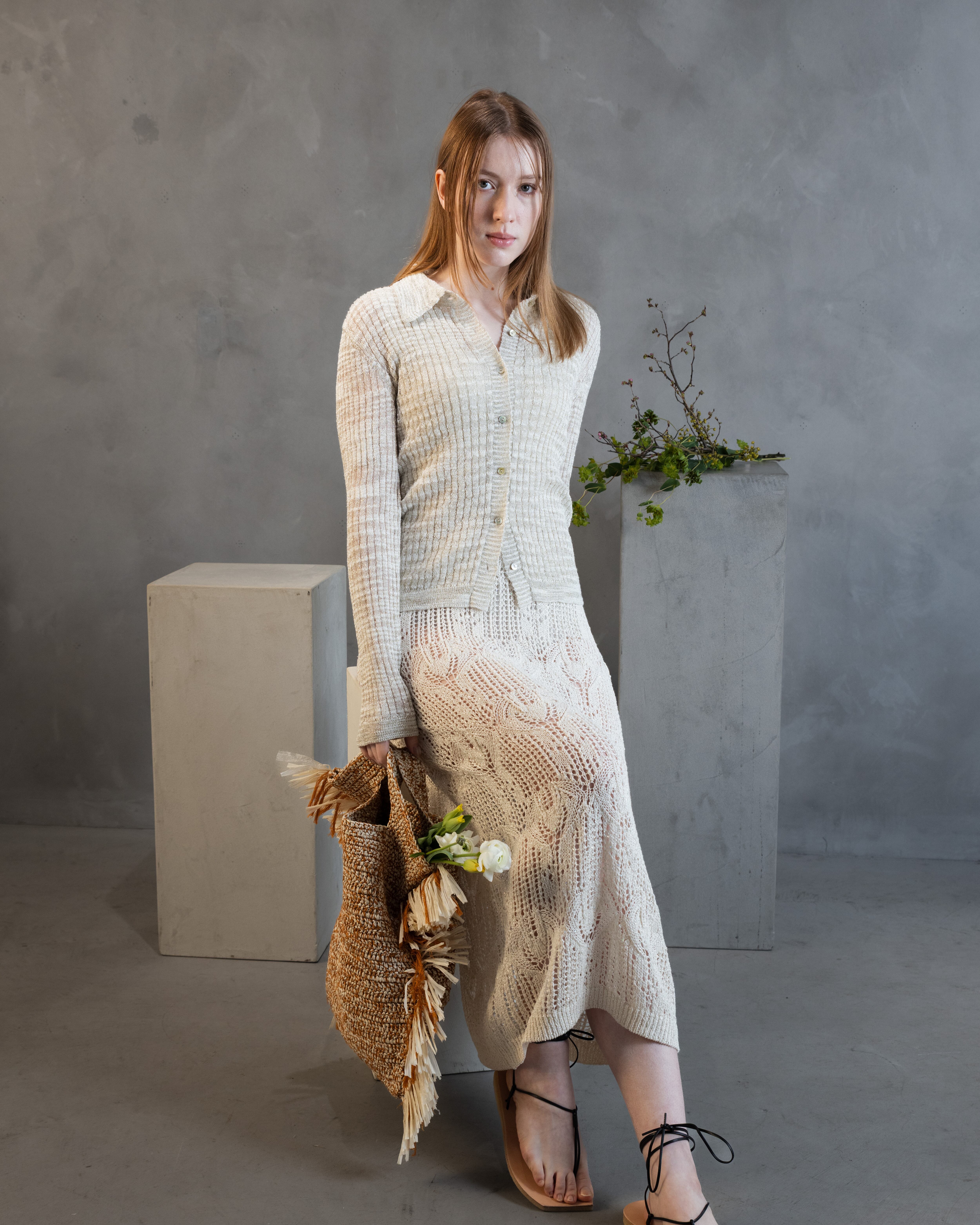 レーシーワンピースと同じ糸で清涼感ある着回し力抜群のカーディガンを展開。