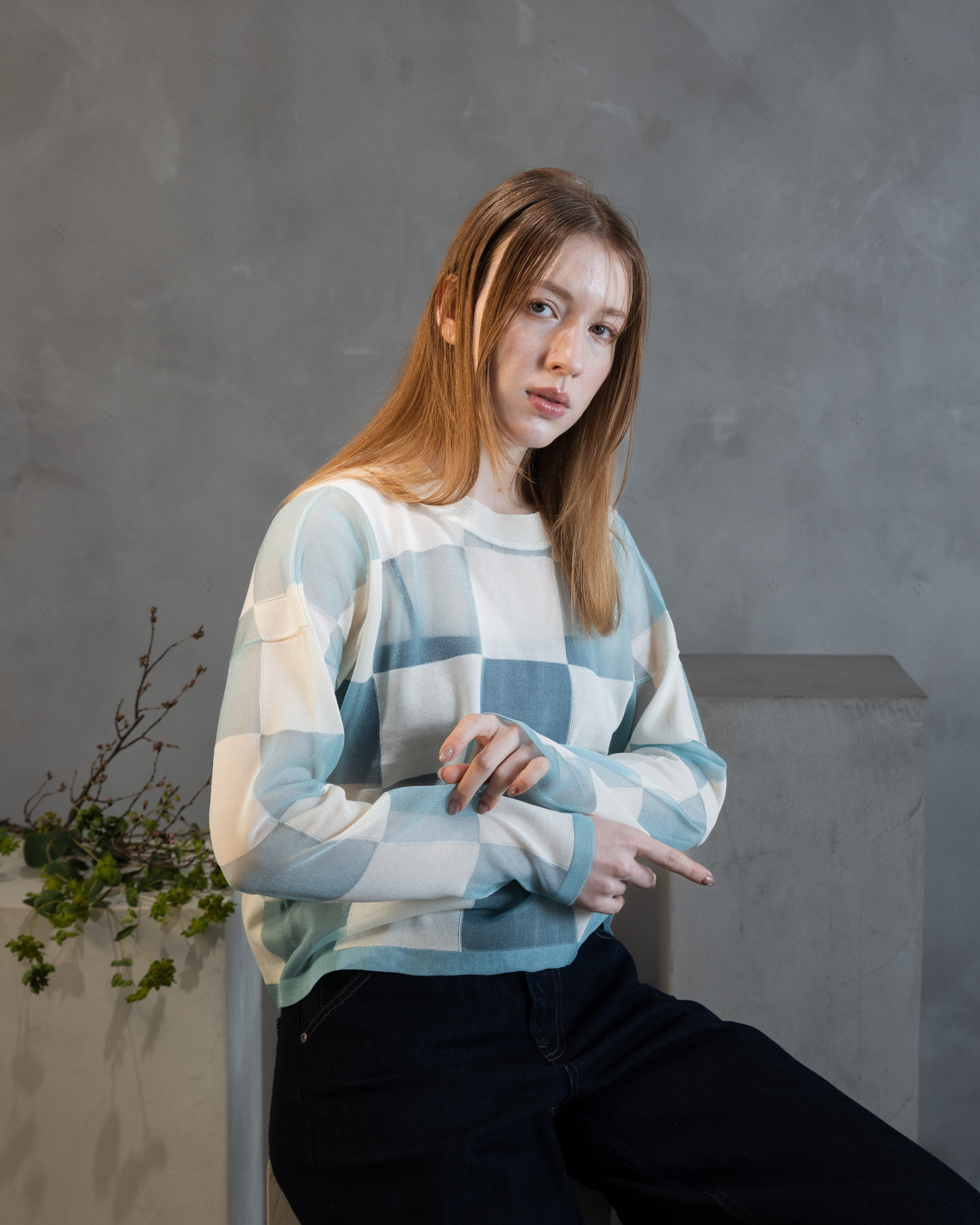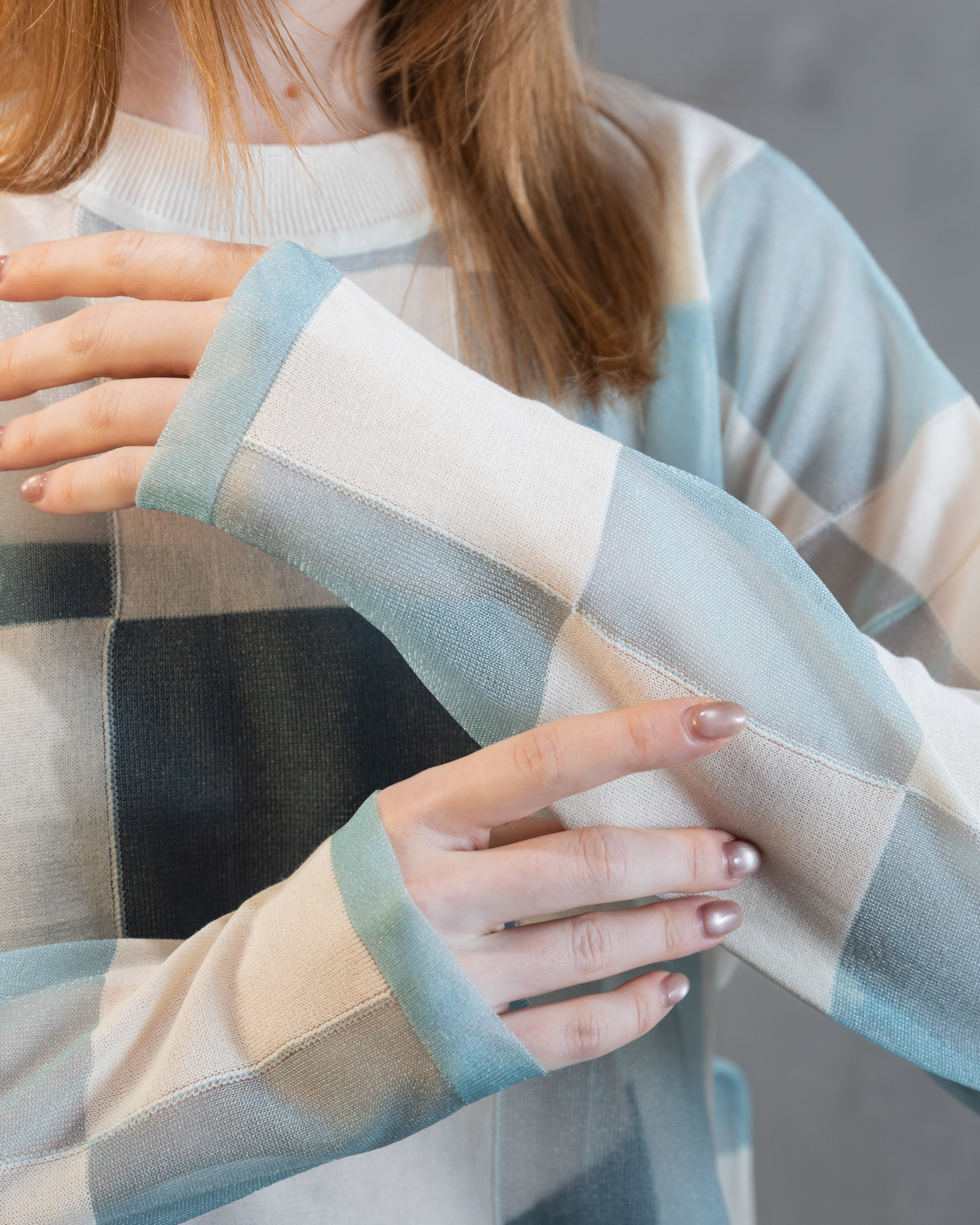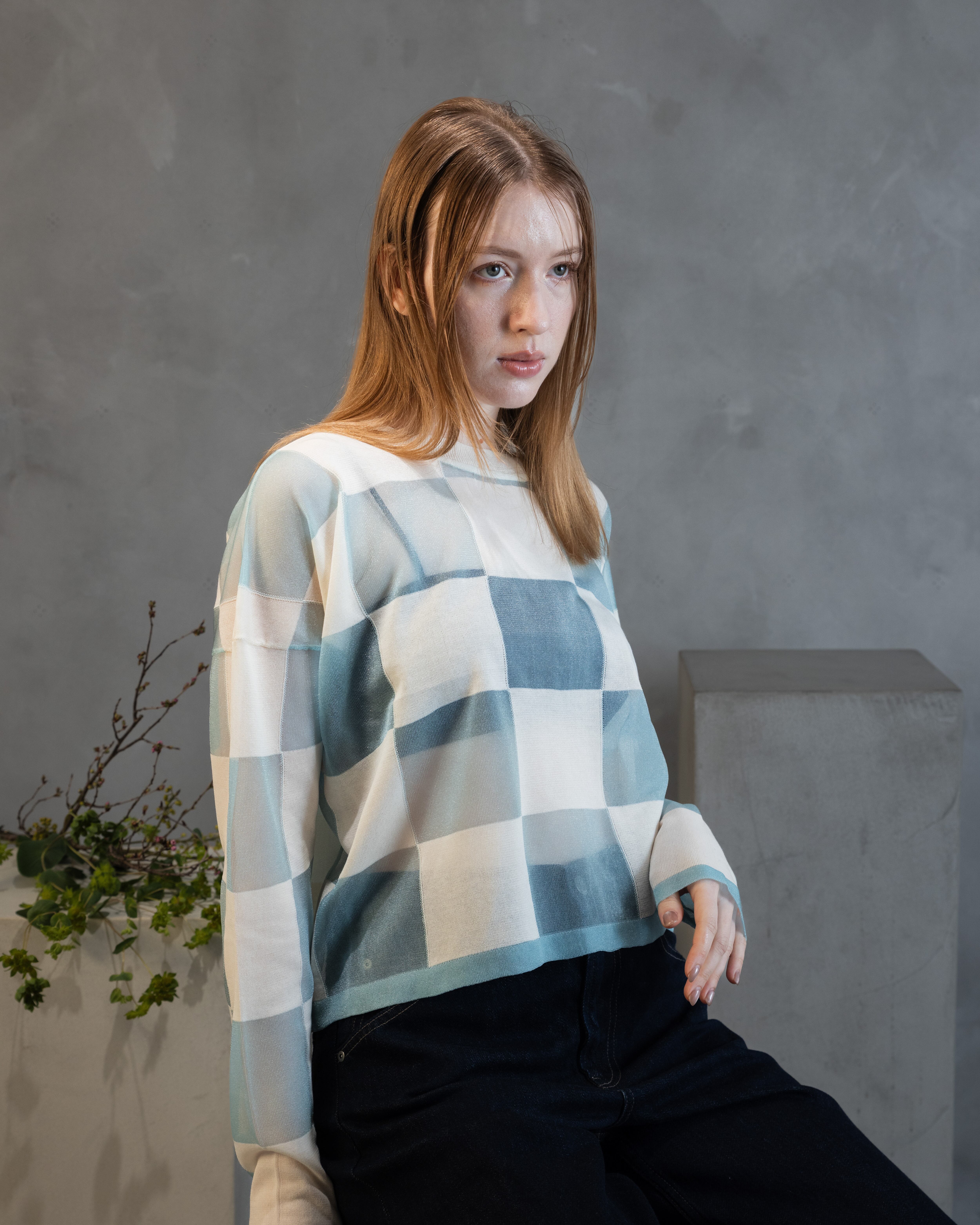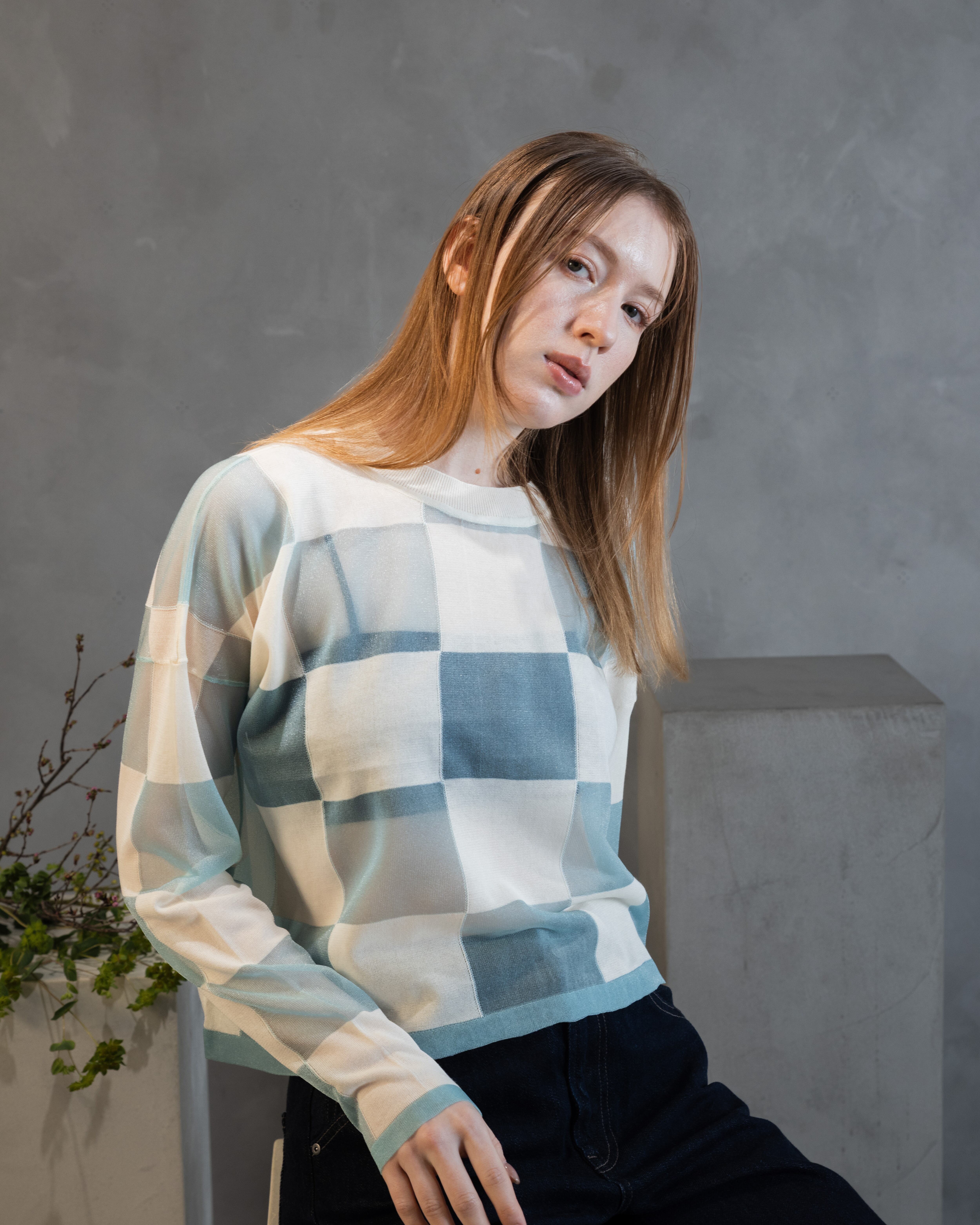 ナチュラル感のあるコットンとシアーな透明感とをブロックチェックに配したカジュアル感あるニットトップ。