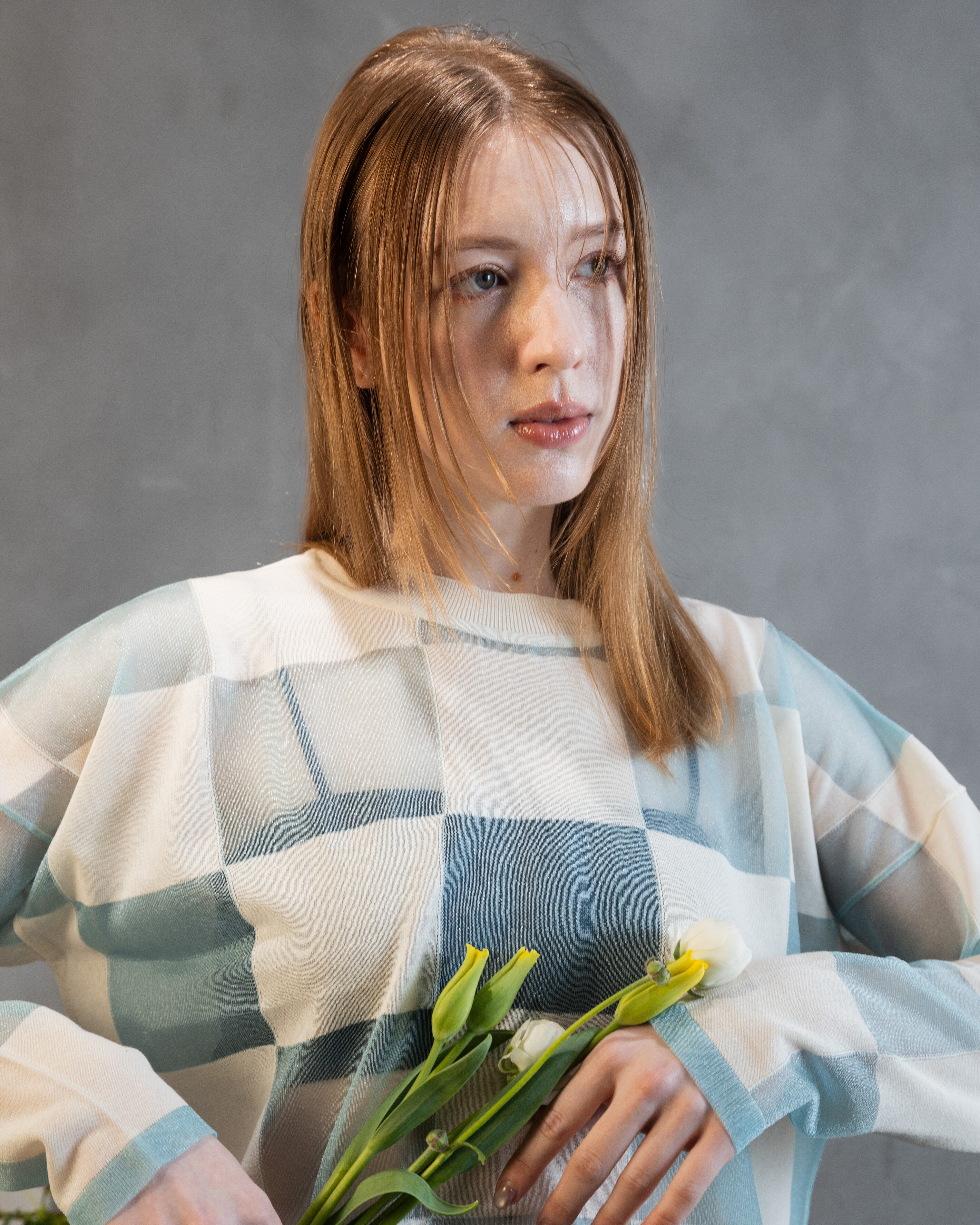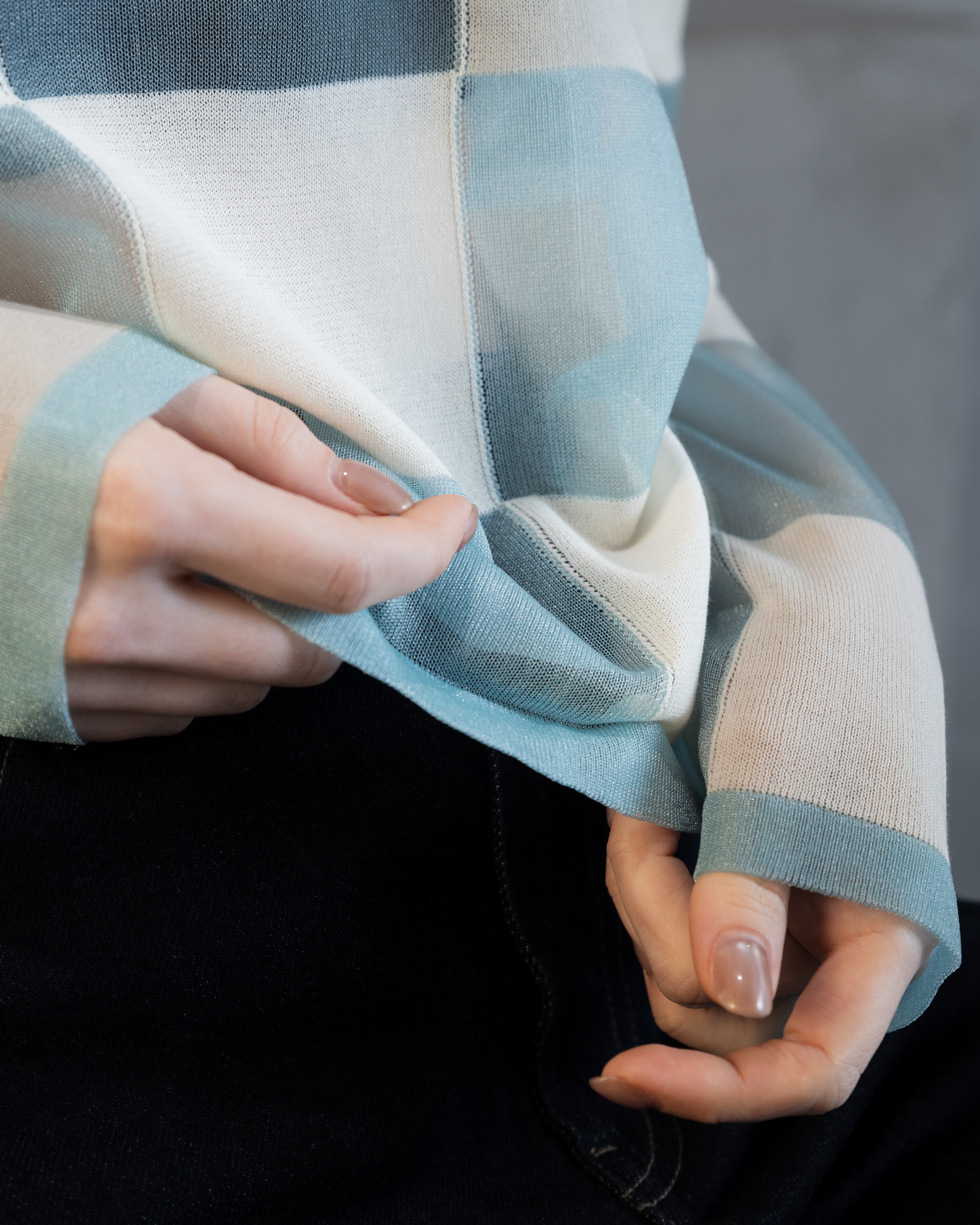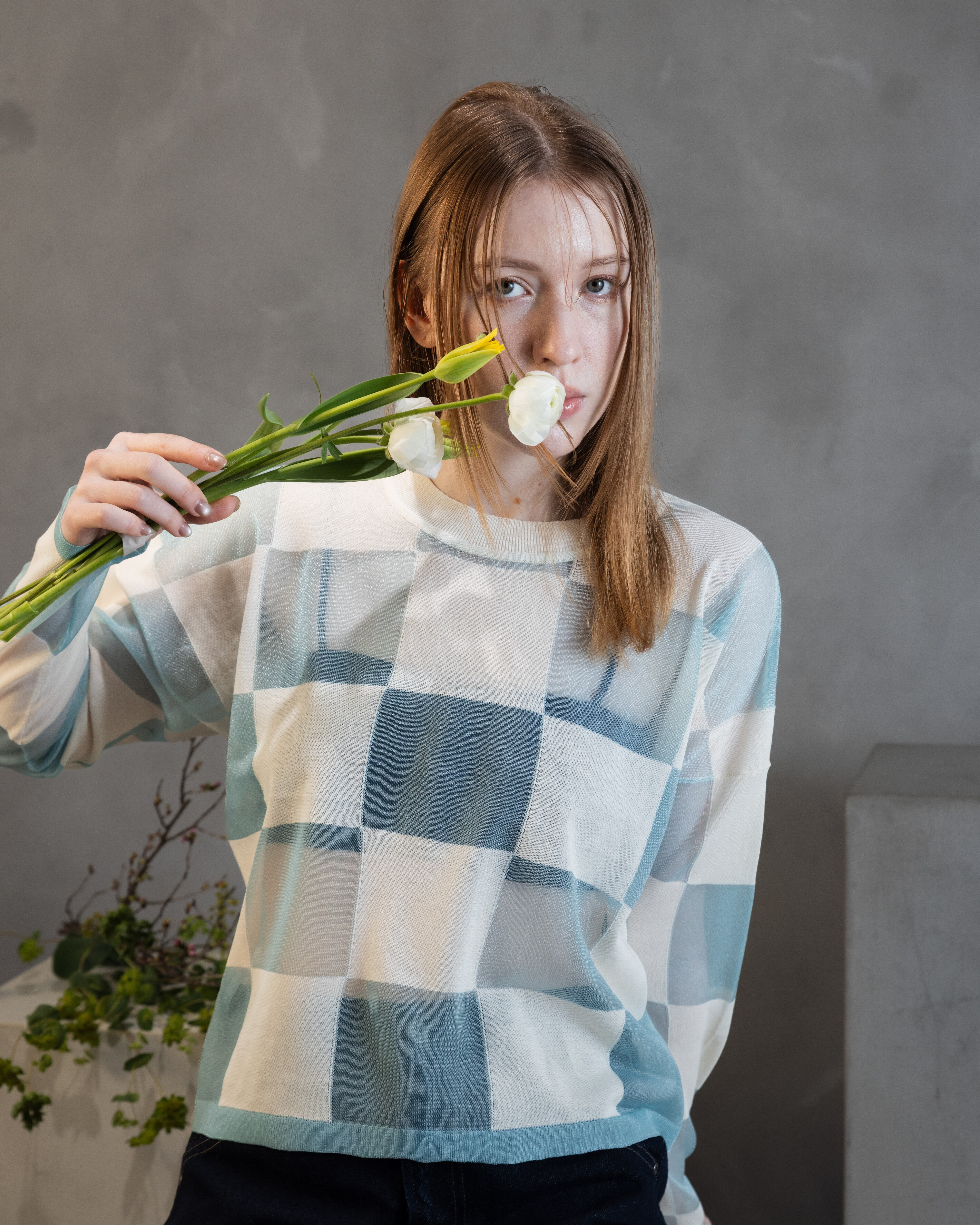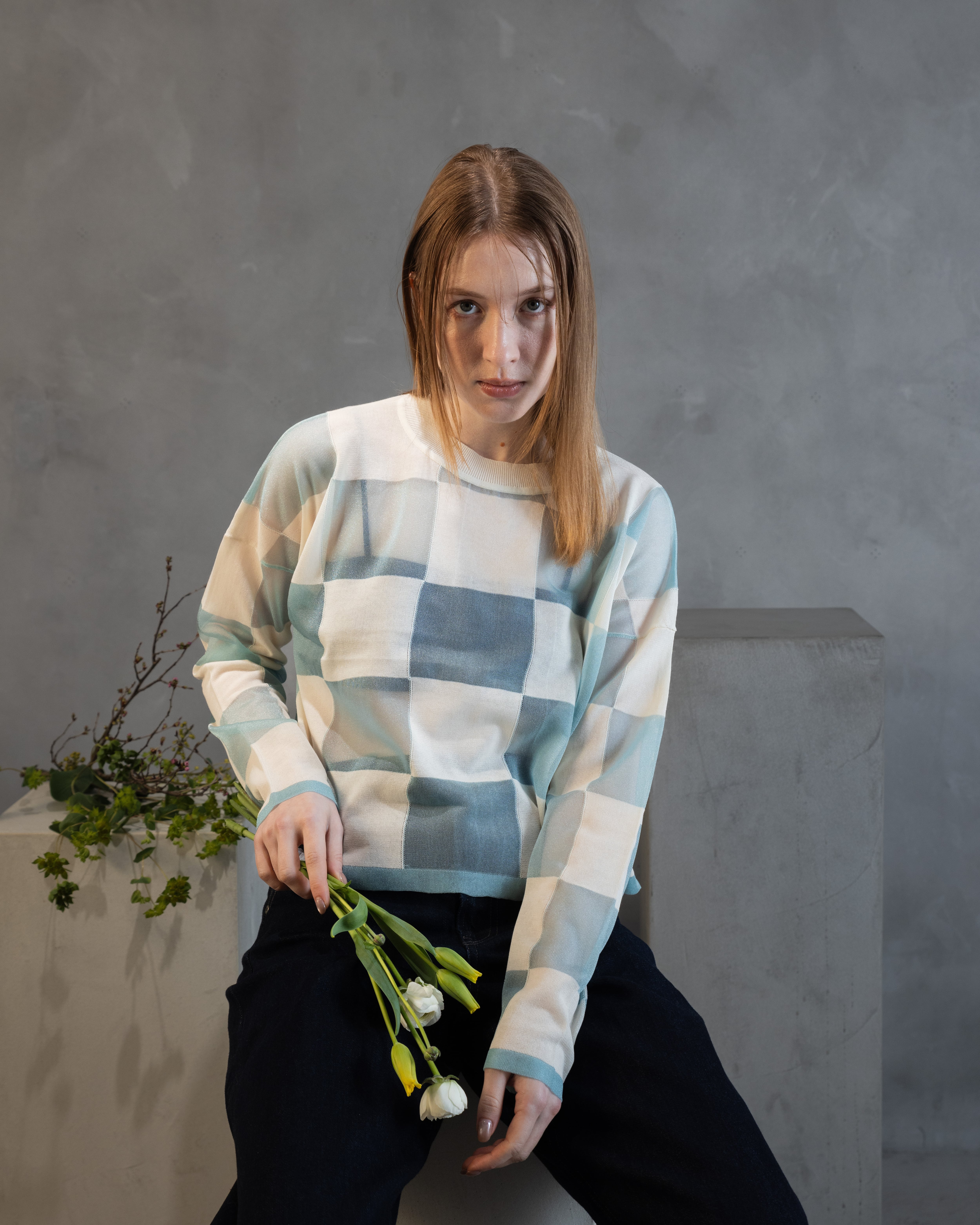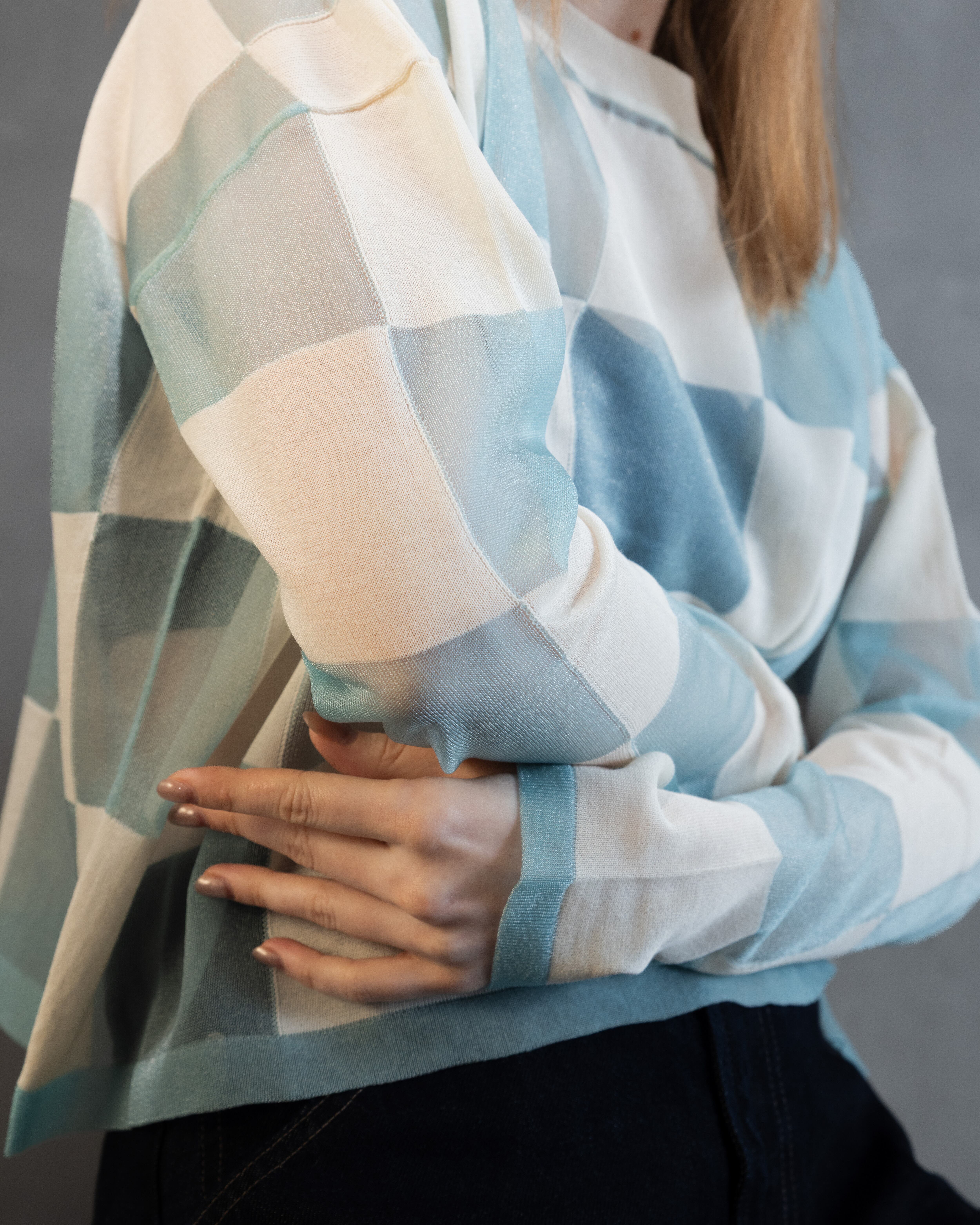ナチュラル感のあるコットンとシアーな透明感とをブロックチェックに配したカジュアル感あるニットトップ。