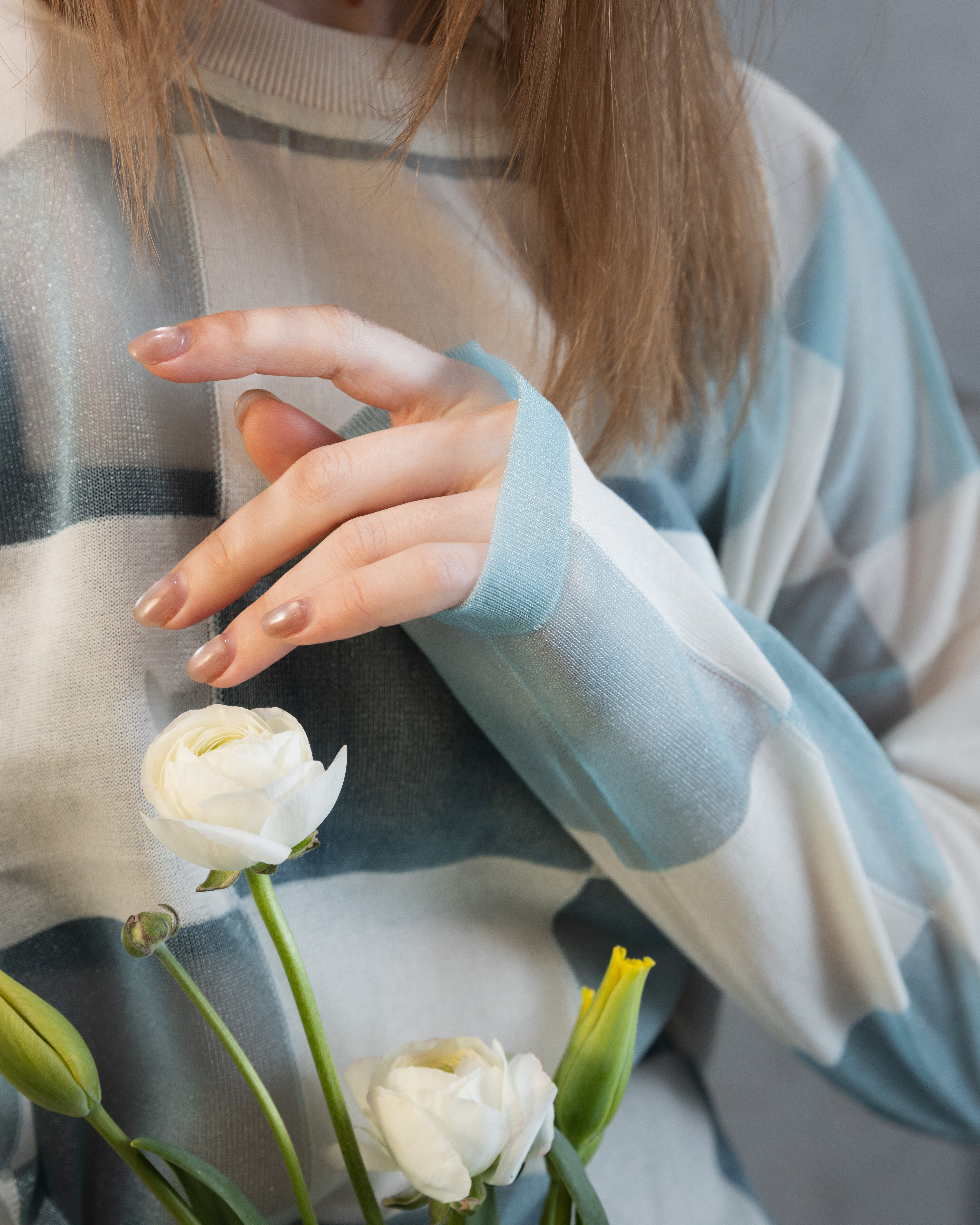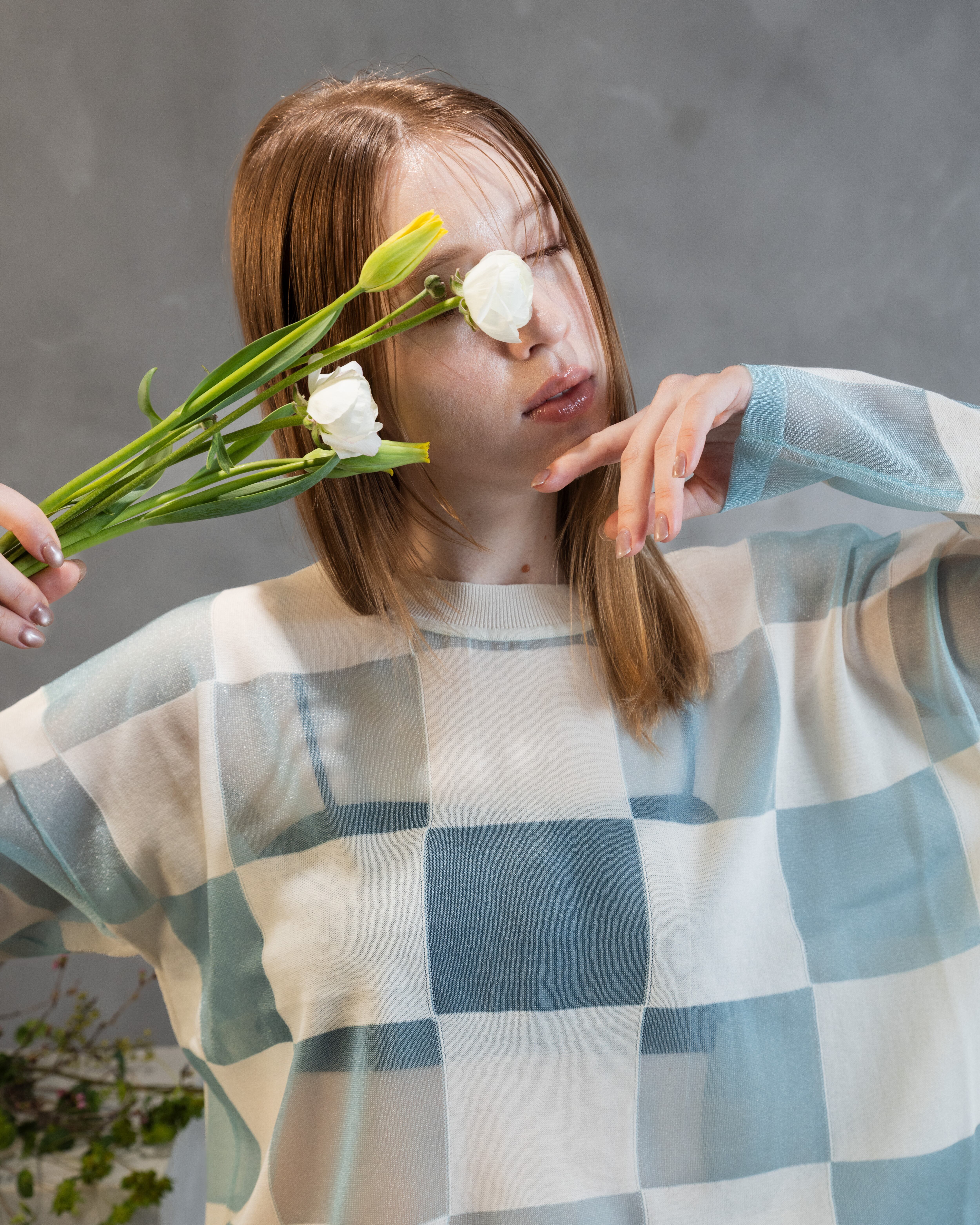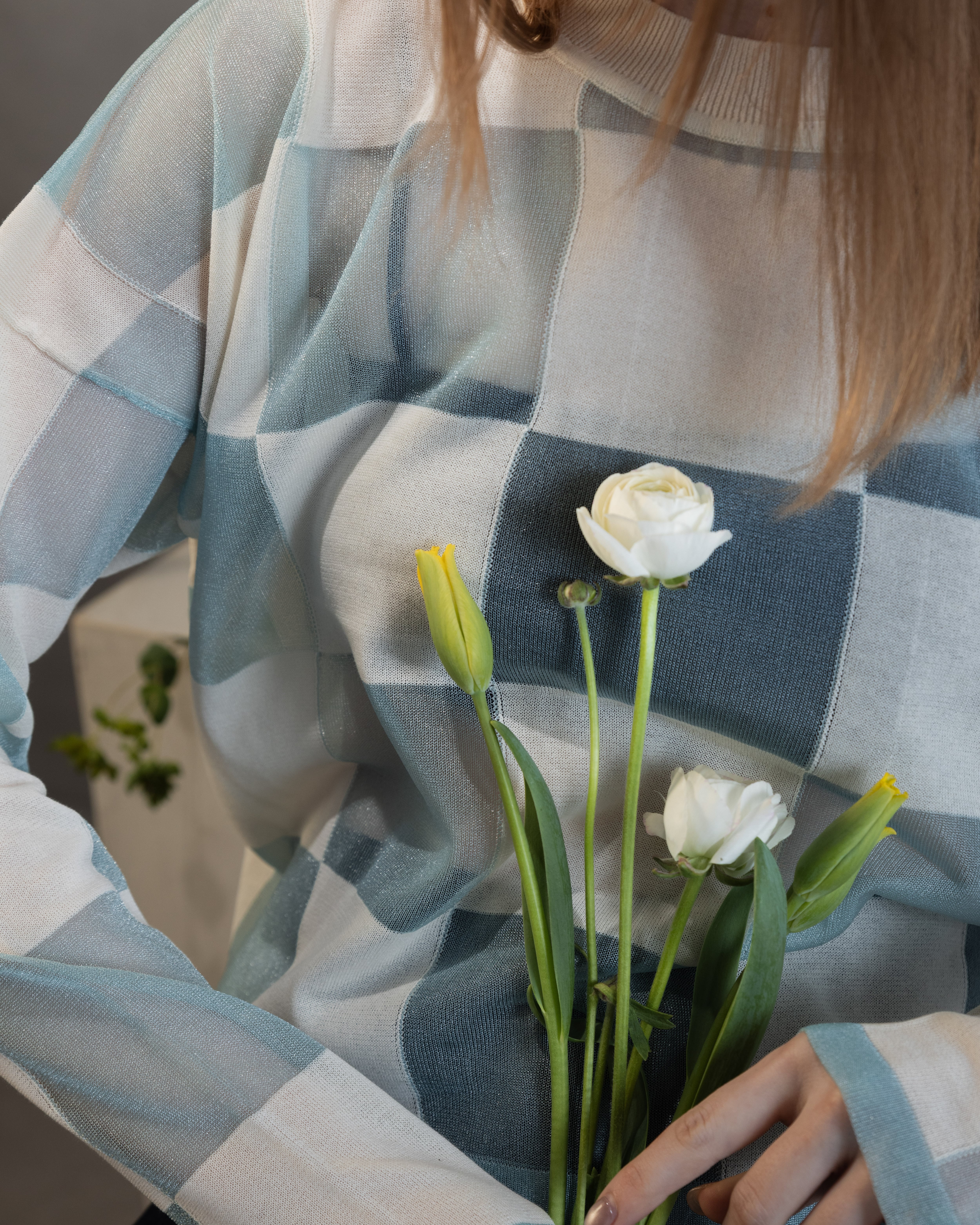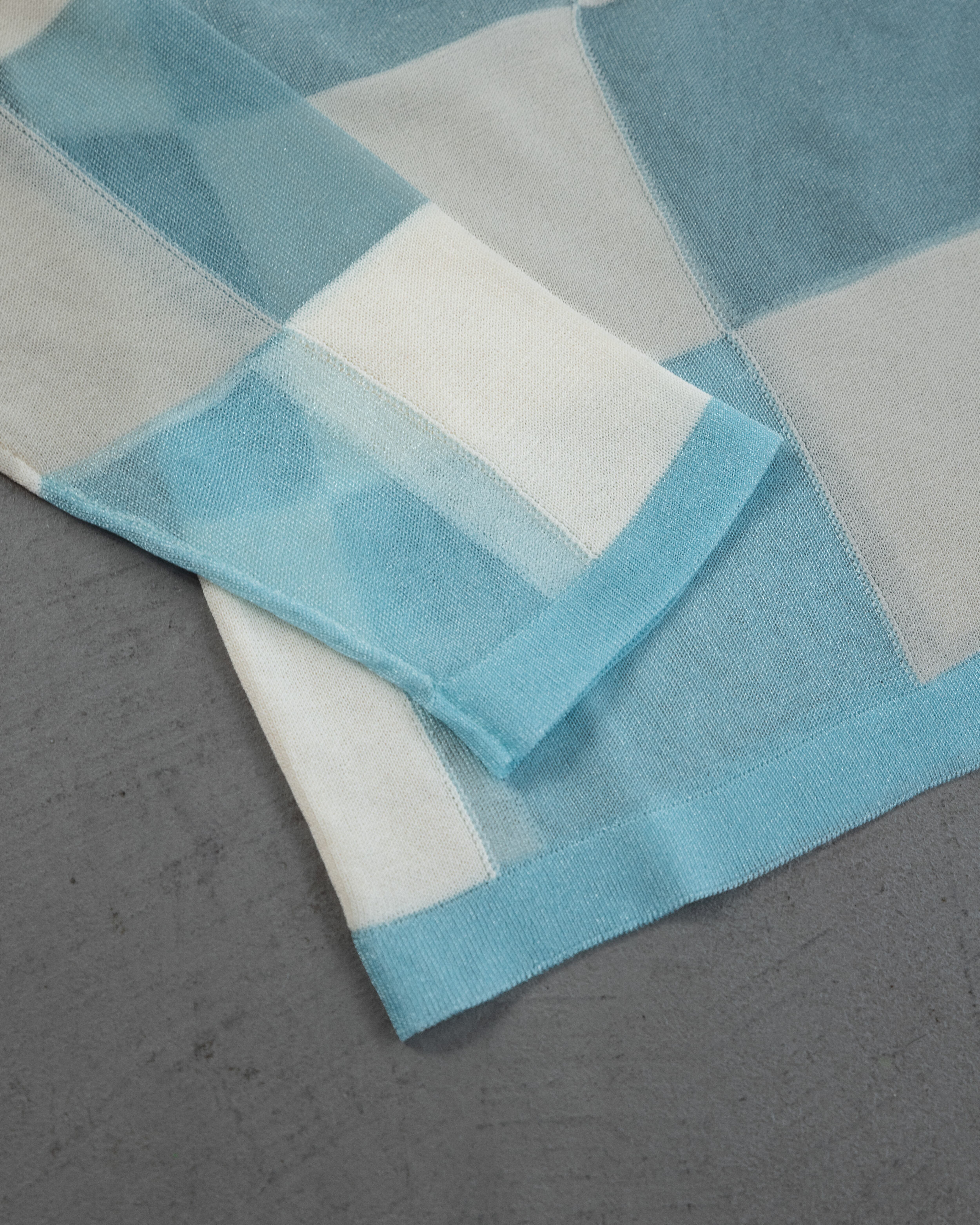 ナチュラル感のあるコットンとシアーな透明感とをブロックチェックに配したカジュアル感あるニットトップ。